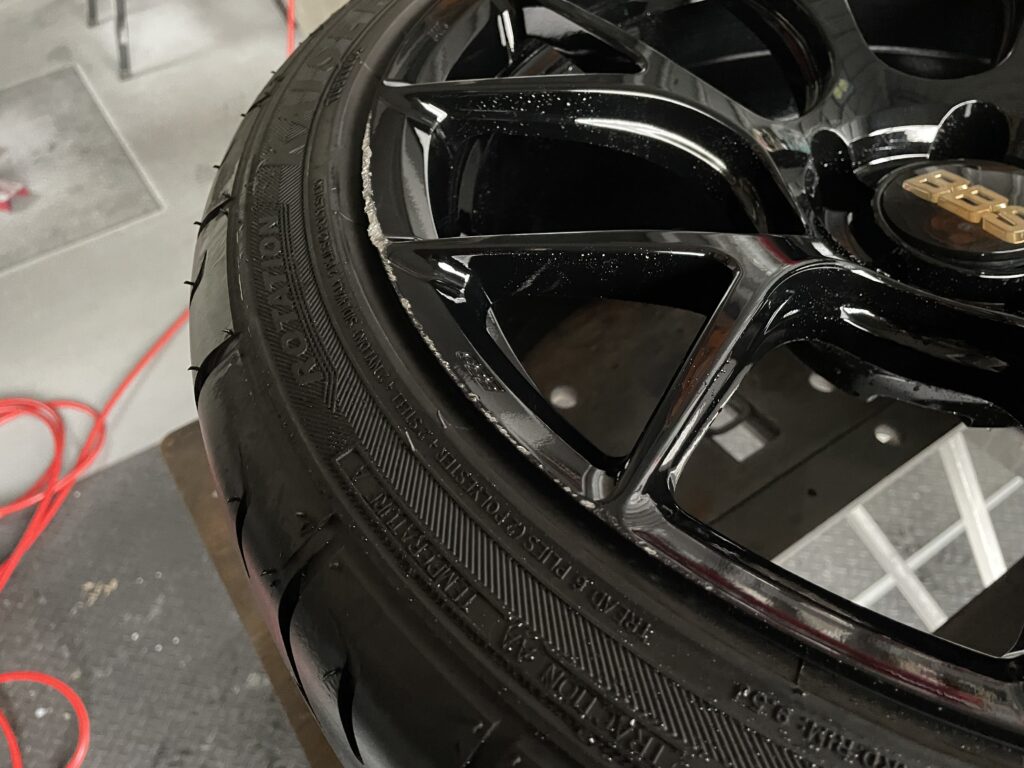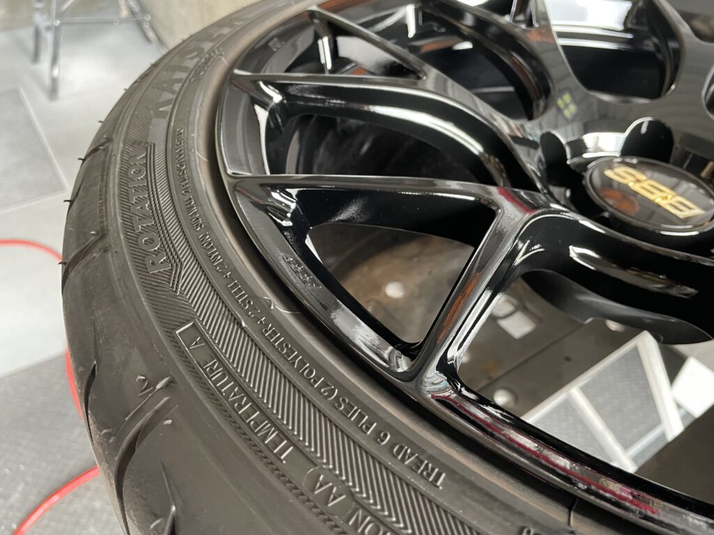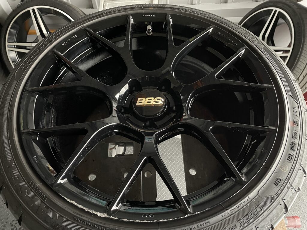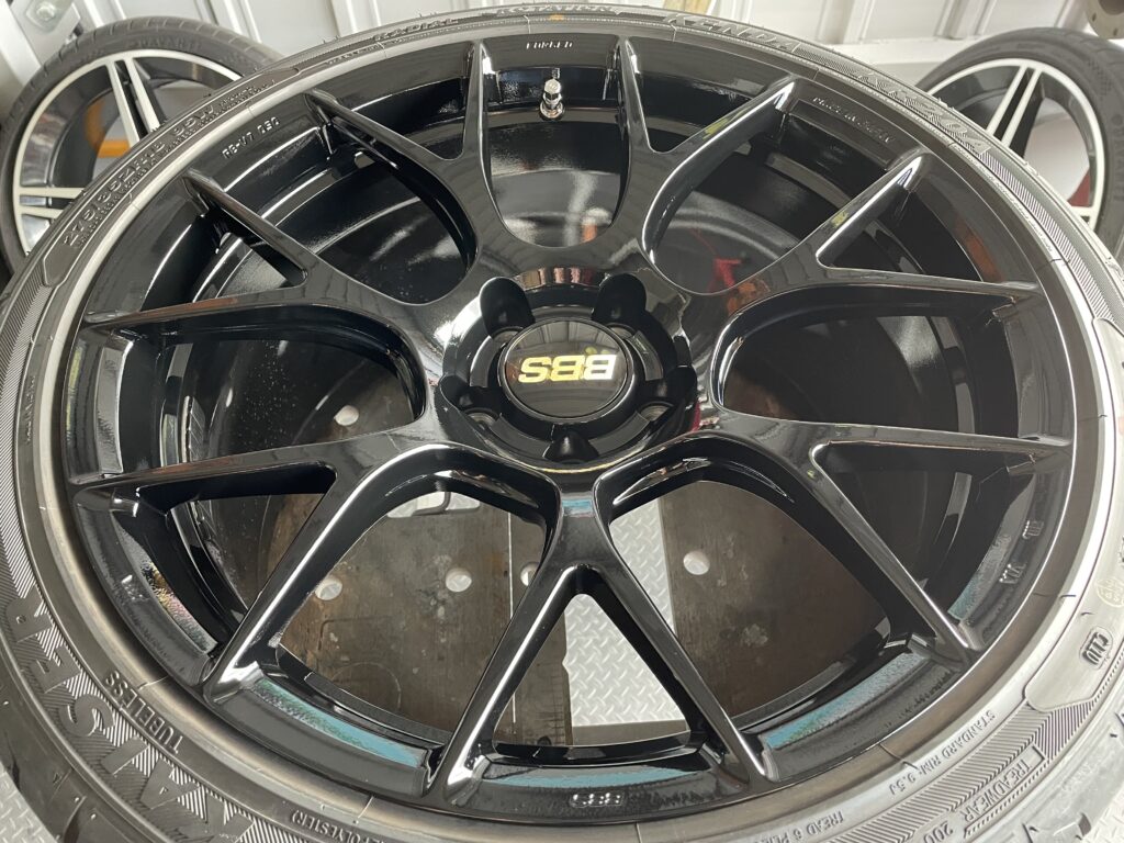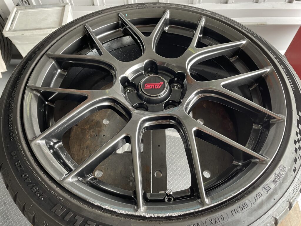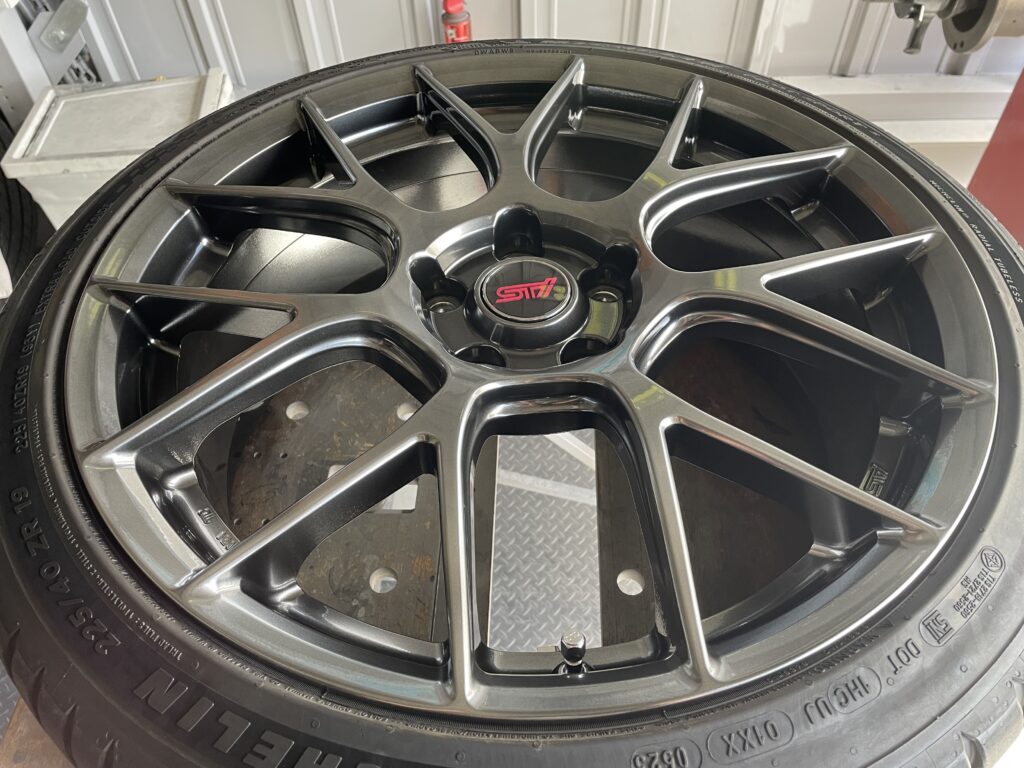 本日の施工はスバルレヴォーグSTIスポーツ#の純正BBSホイールガリキズをスーパーブラックハイラスター塗装でリペアさせていただきました。