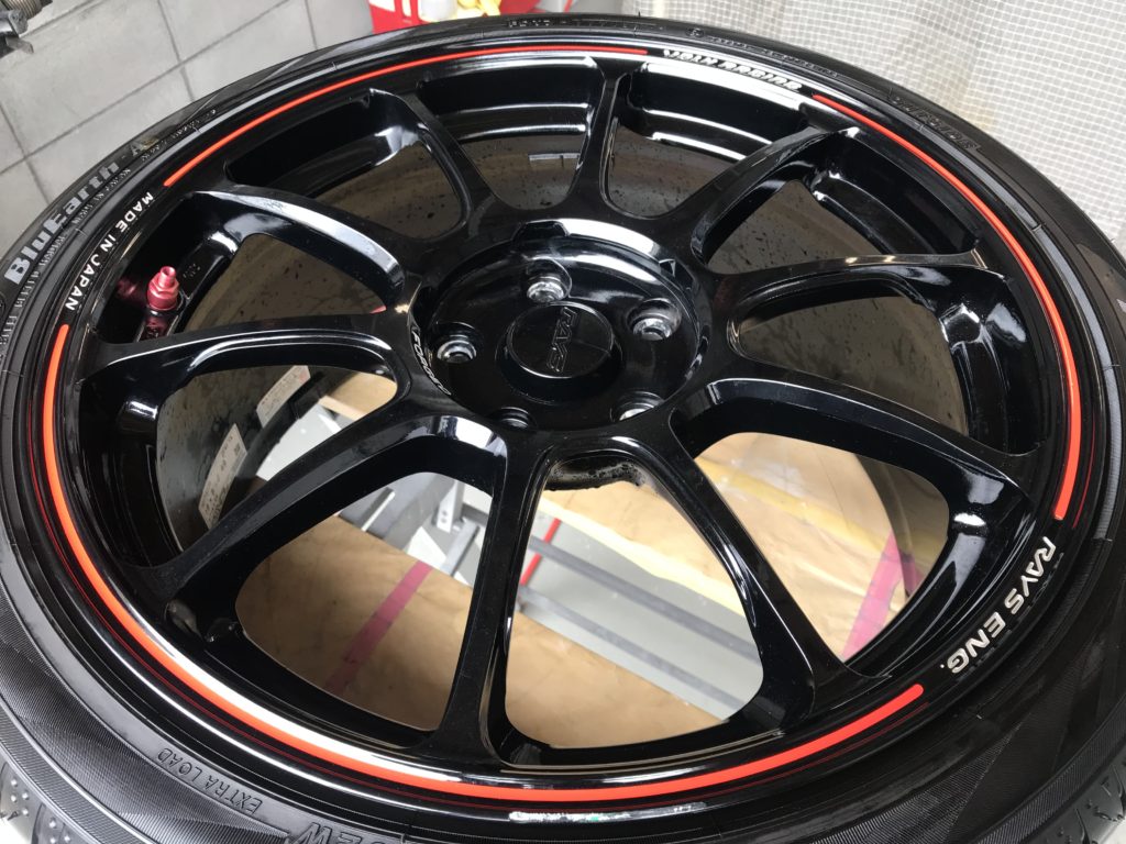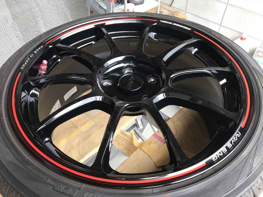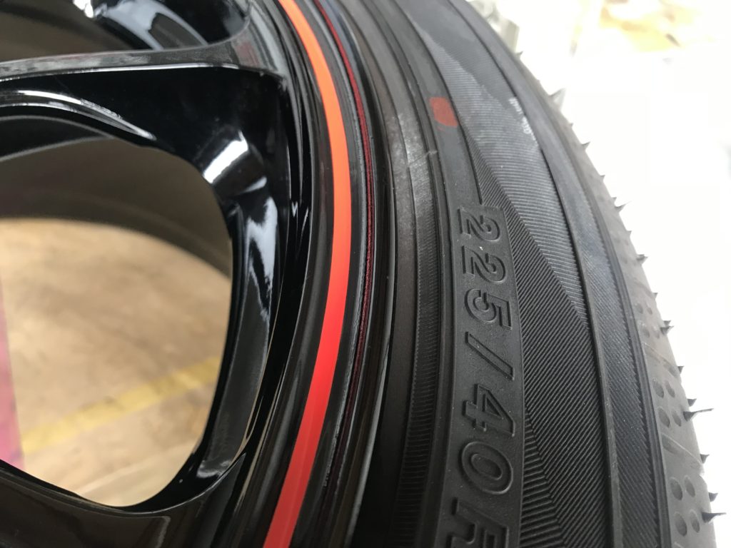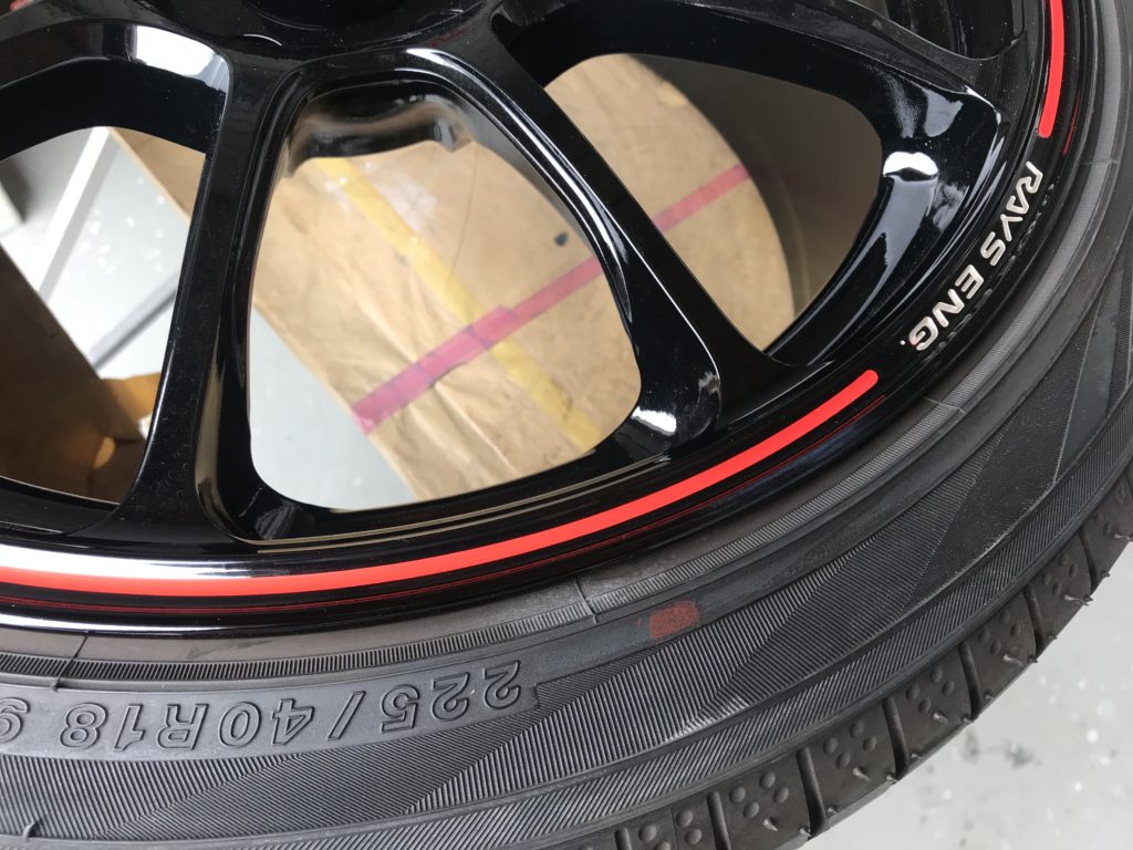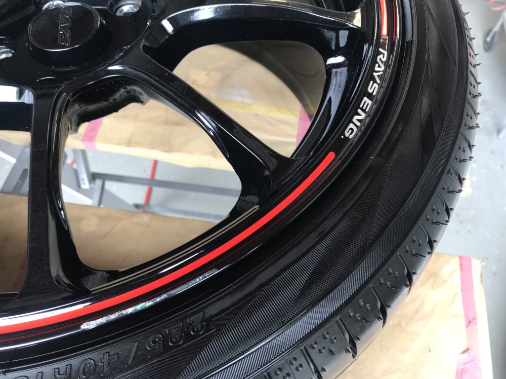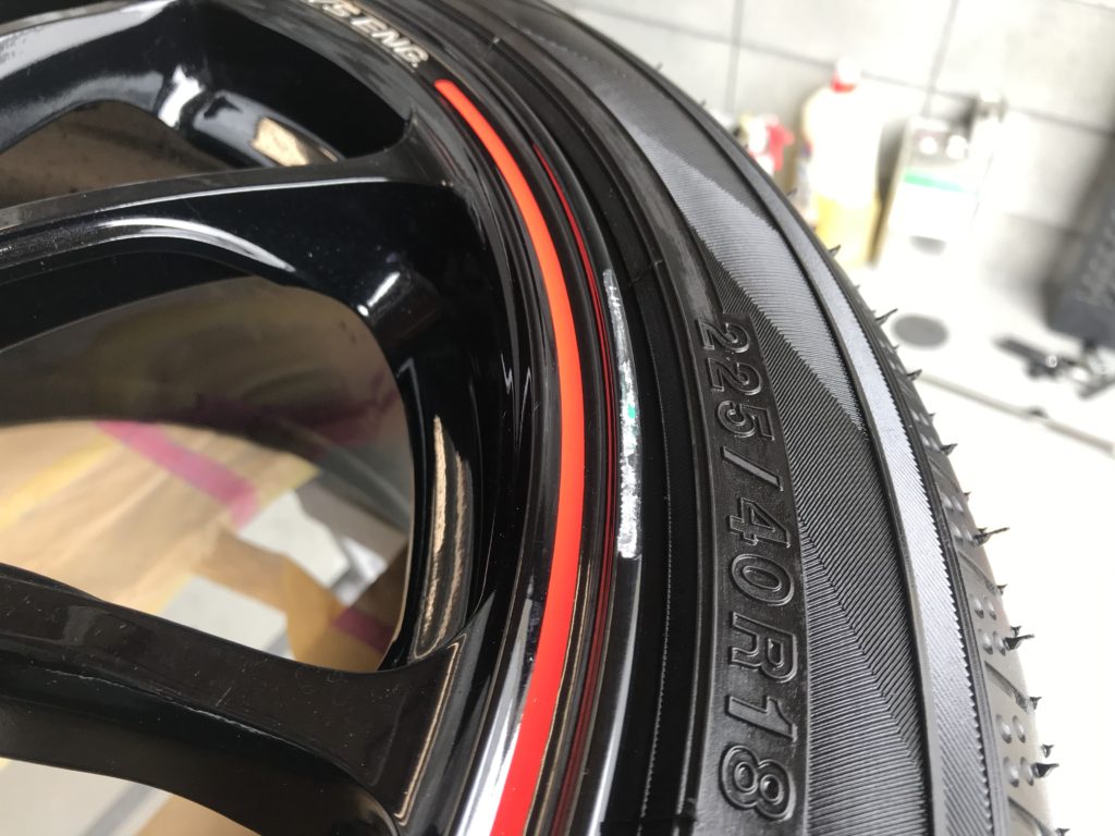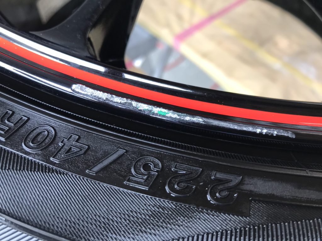 CRAFTS505の施工実績をご覧いただきありがとうございます、本日の施工はレイズレッドライン入りホイールのリムキズをブラック塗装でリペアさせていただきました。