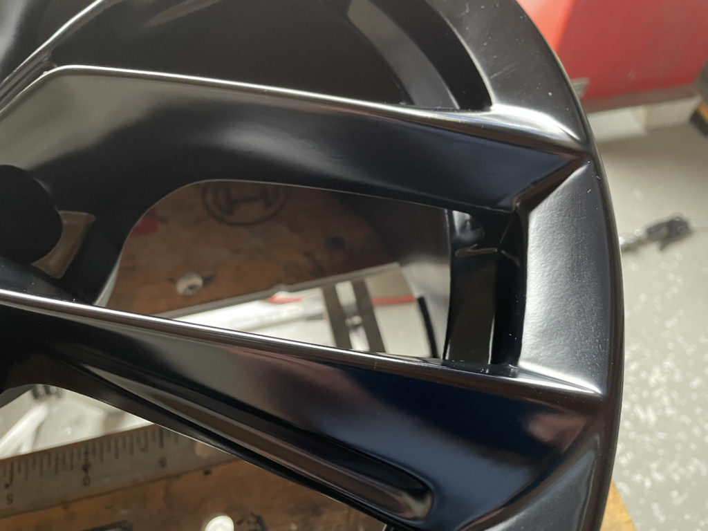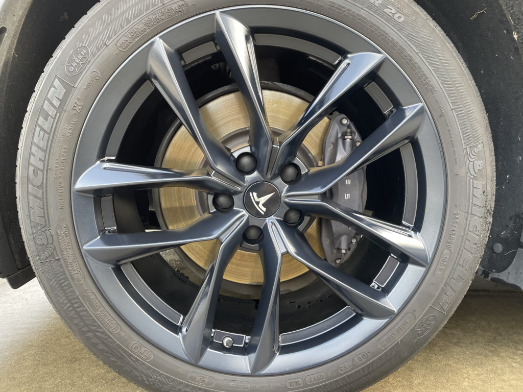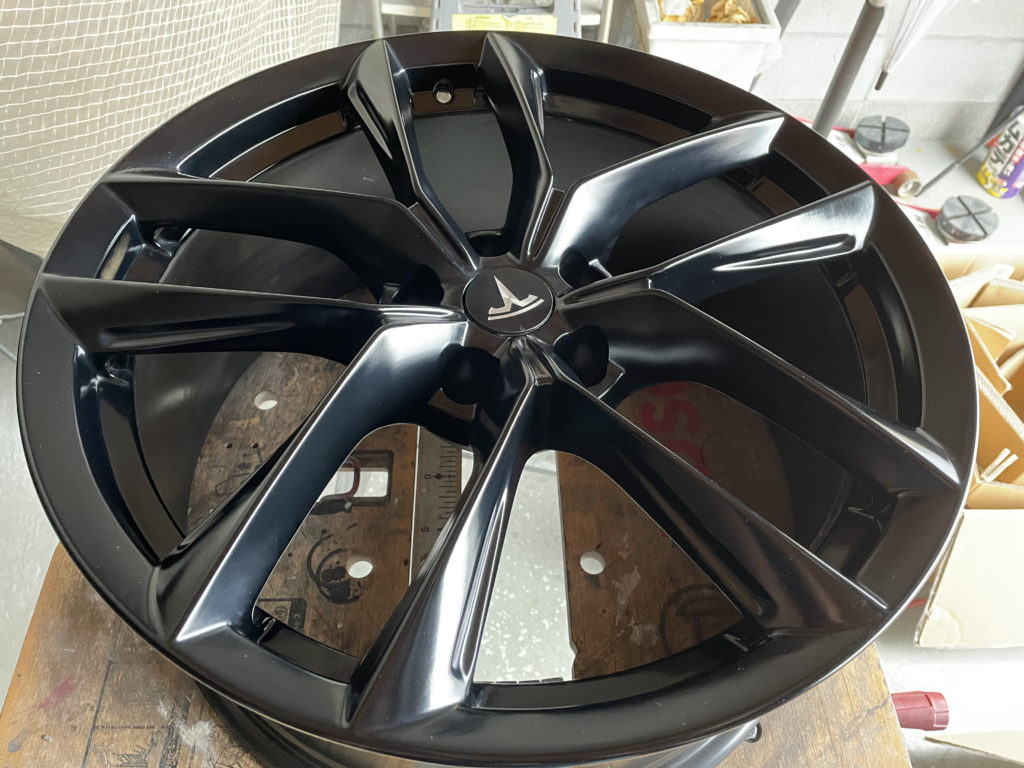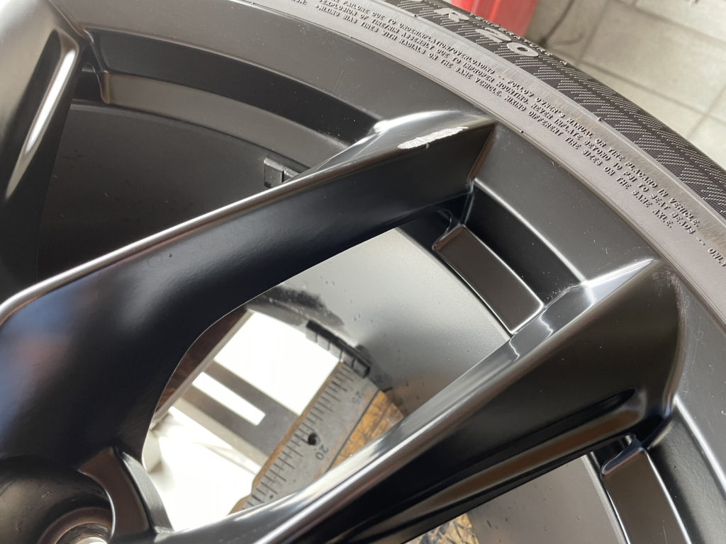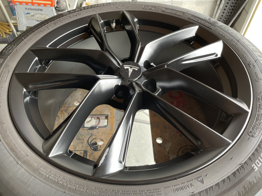 CRAFTS505の施工実績をご覧いただきありがとうございます、本日はテスラモデルXの特別注文された純正ホイールキズをマットブラック塗装でリペアさせていただきました。