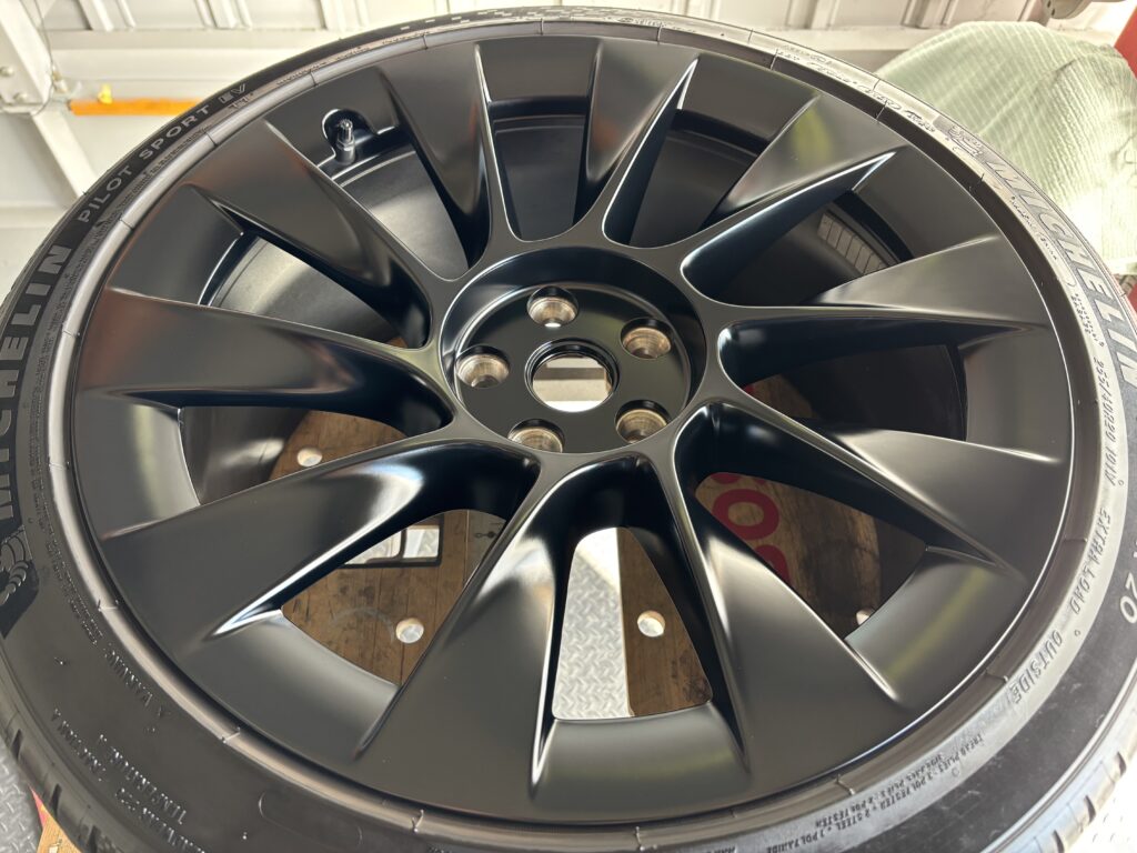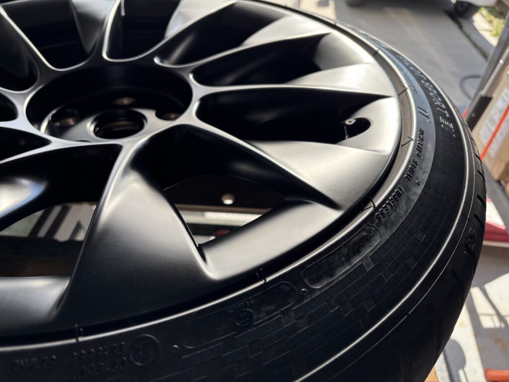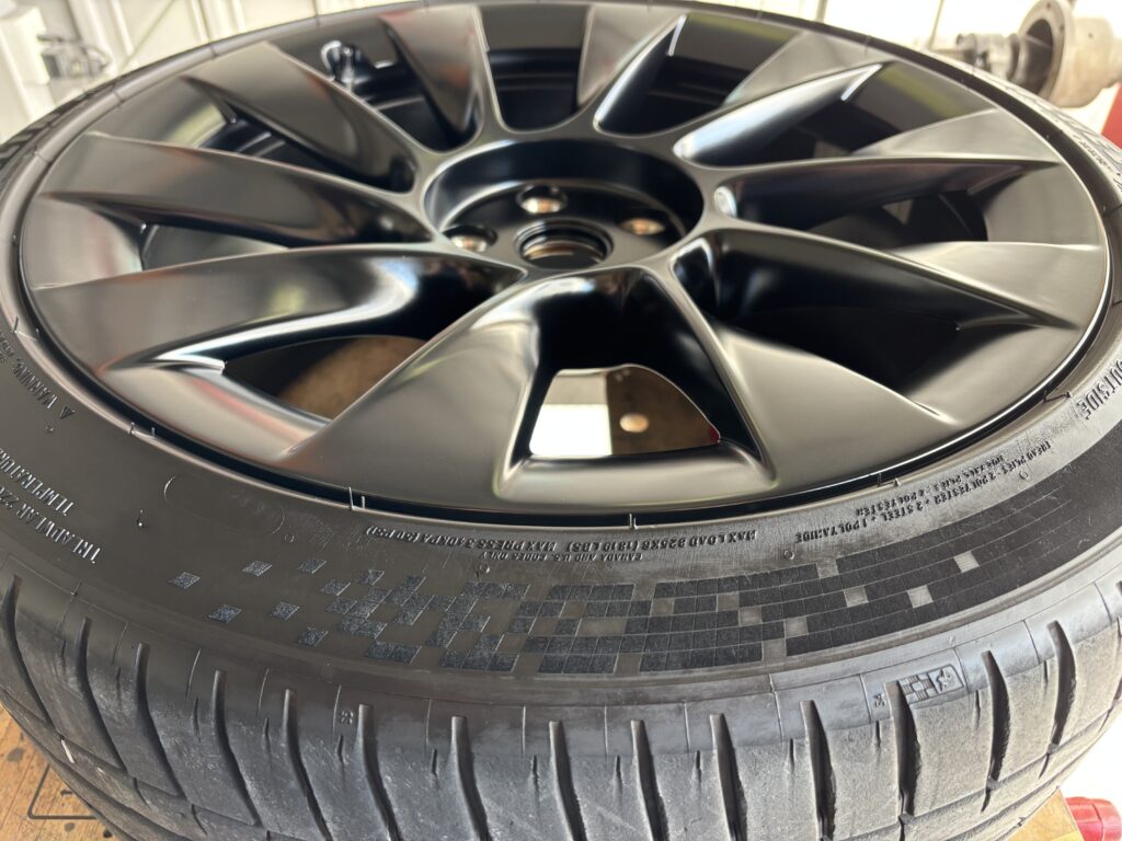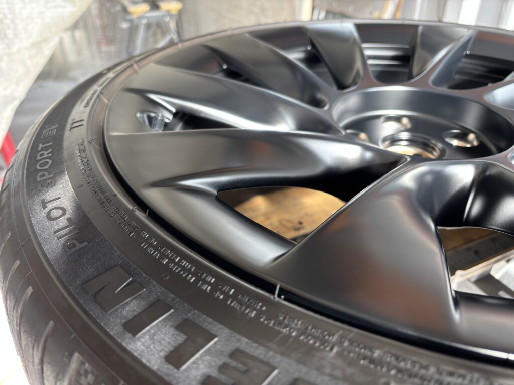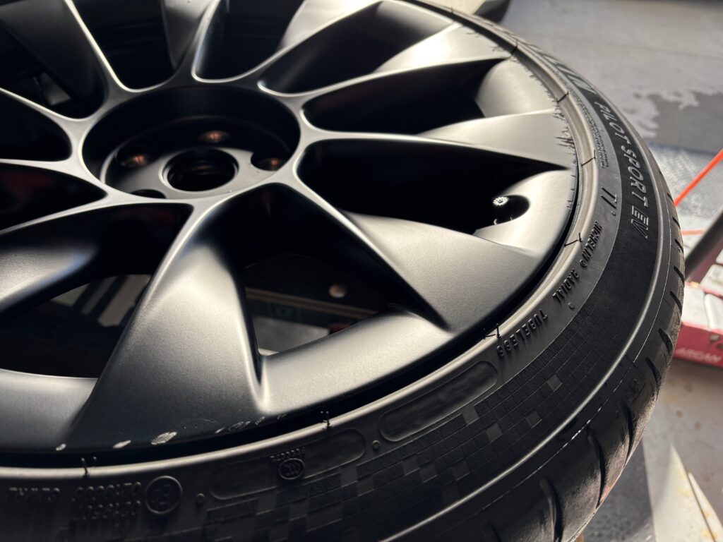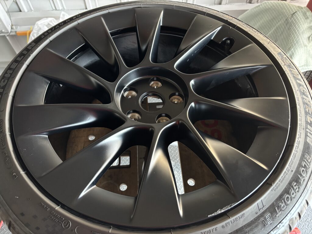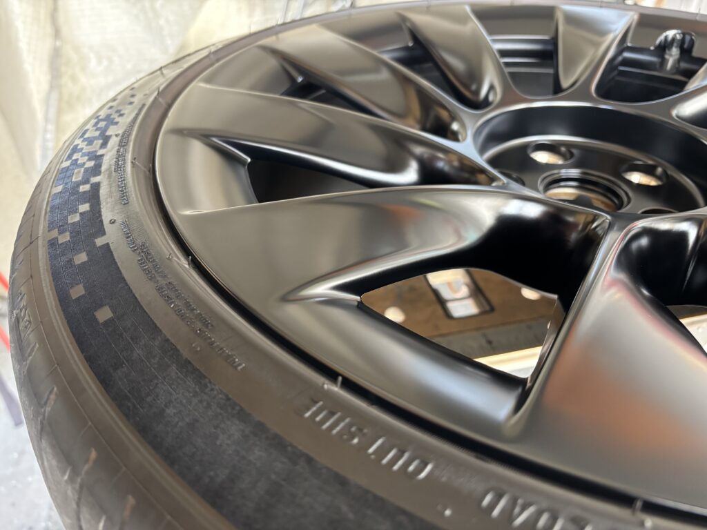 本日はテスラ モデルYの純正アルミホイールガリキズ 4本をアルミ硬化パテを充填してマットブラック塗装でリペアさせていただきました。