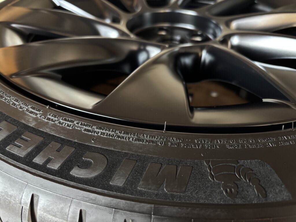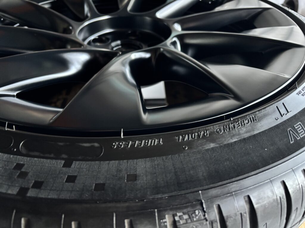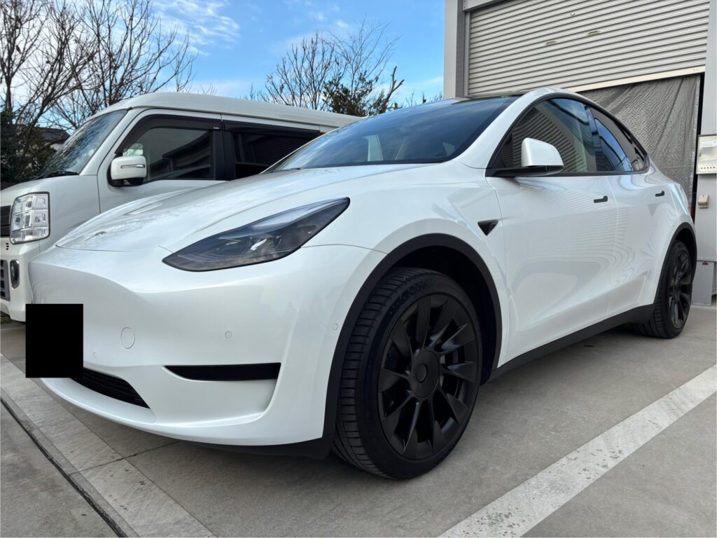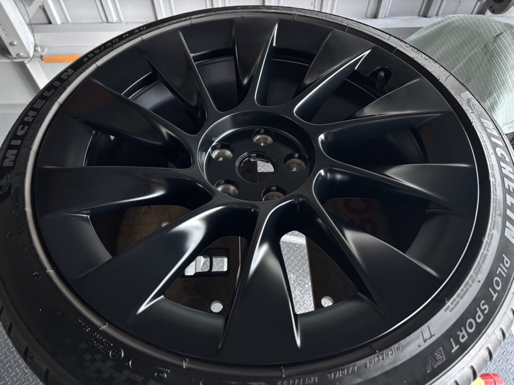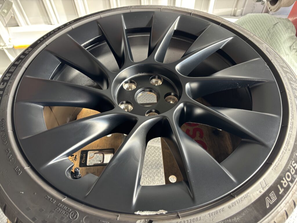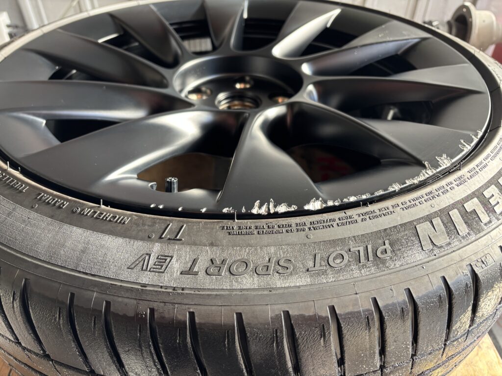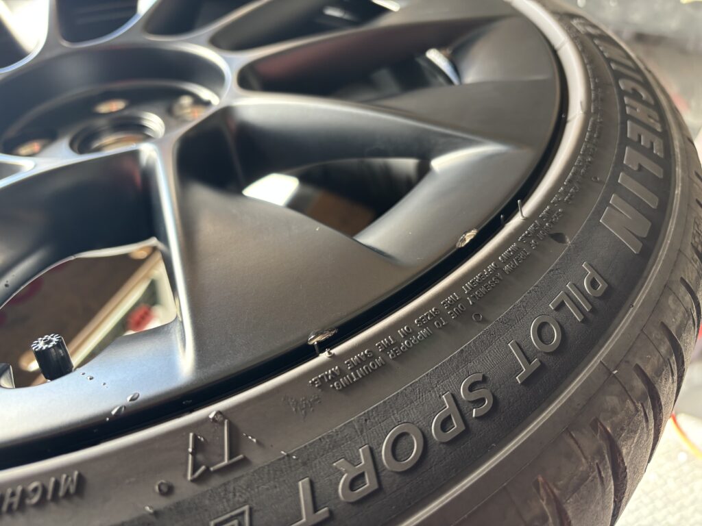 本日はテスラ モデルYの純正アルミホイールガリキズ 4本をアルミ硬化パテを充填してマットブラック塗装でリペアさせていただきました。