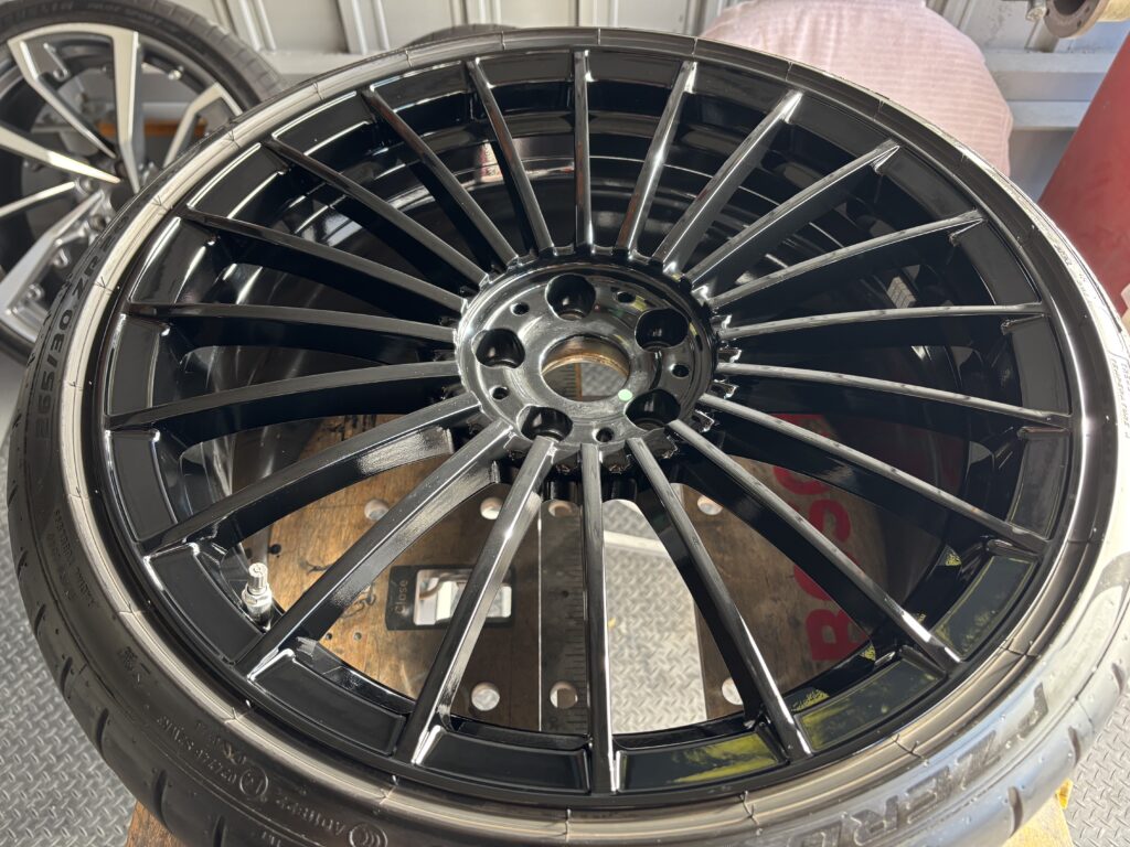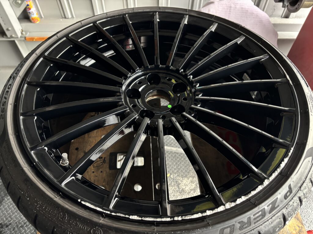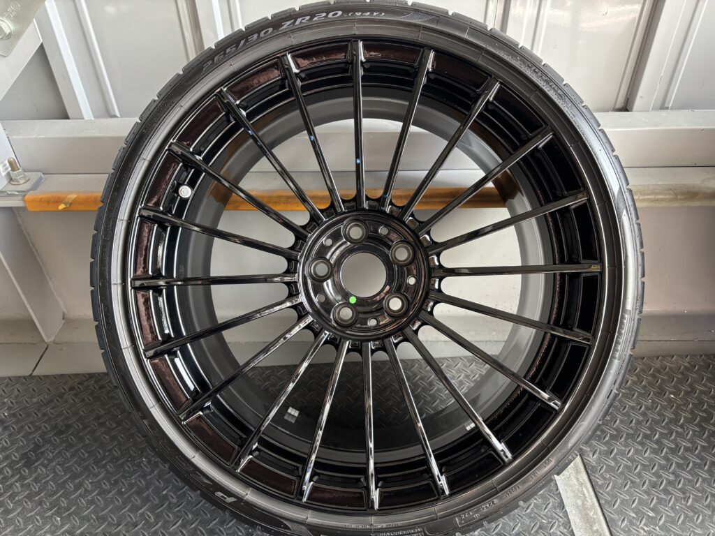 本日はBMW ALPINAのアルミホイールガリキズをアルミ用硬化パテを充填してブラック塗装でリペアさせていただきました。