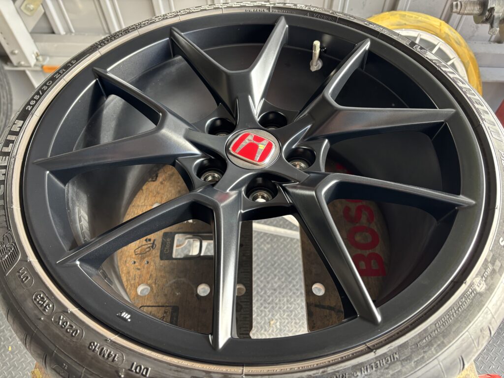 本日はホンダ・シビックTypeRの純正アルミホイールガリキズをマットブラック塗装でリペアさせていただきました。
