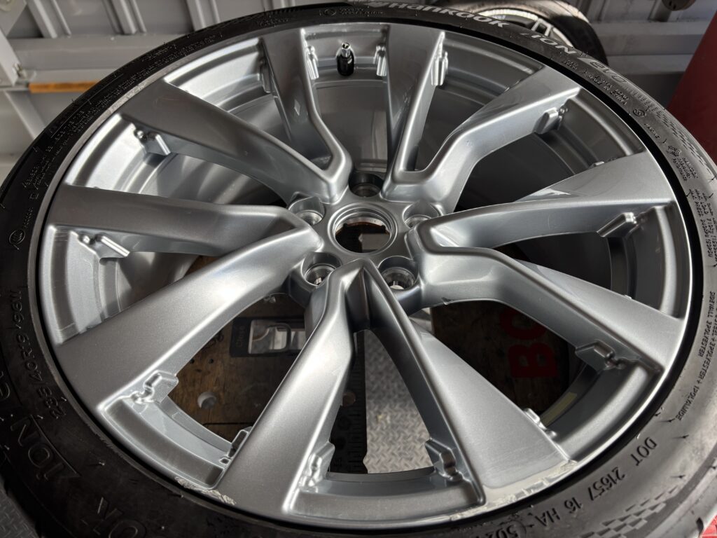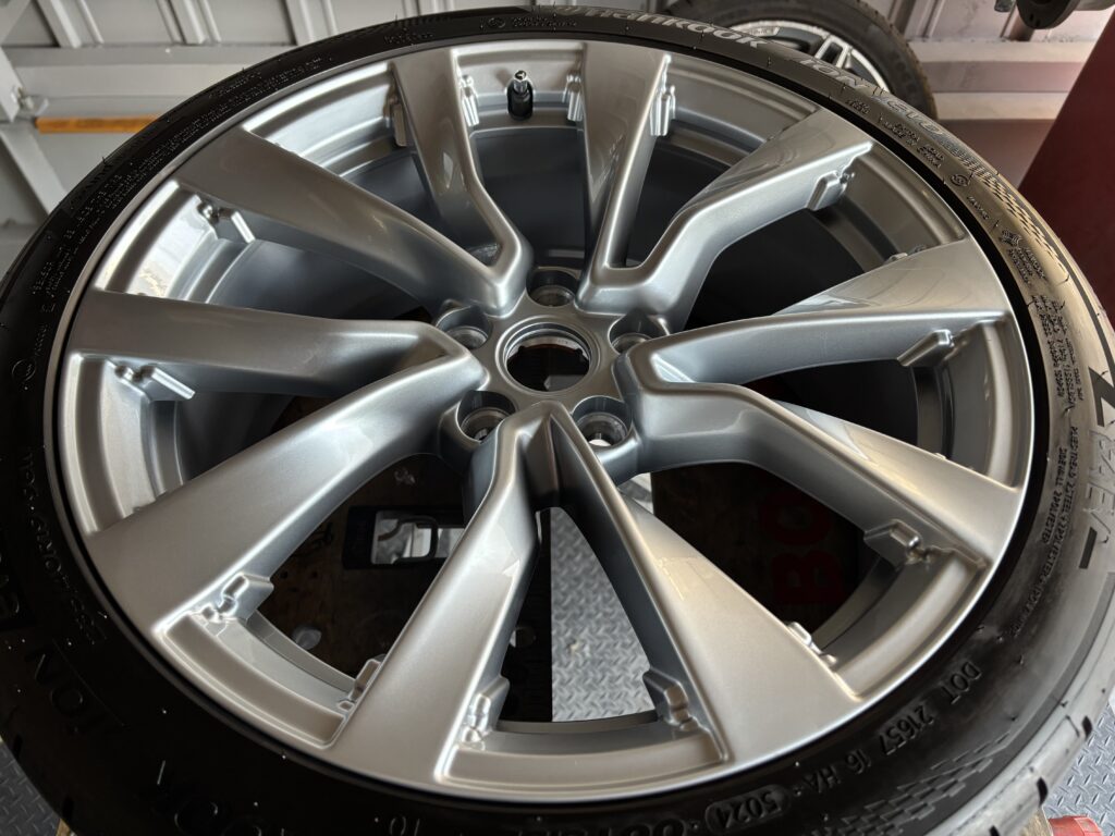 本日はテスラ モデル3の純正アルミホイールガリキズをシルバー塗装でリペアさせていただきました。