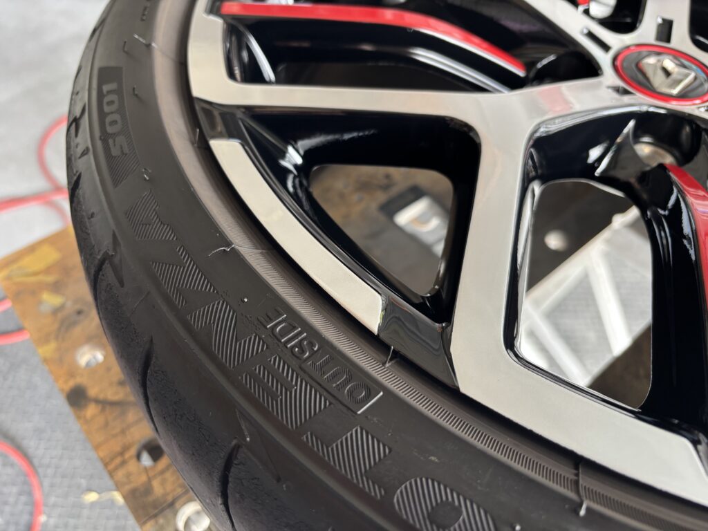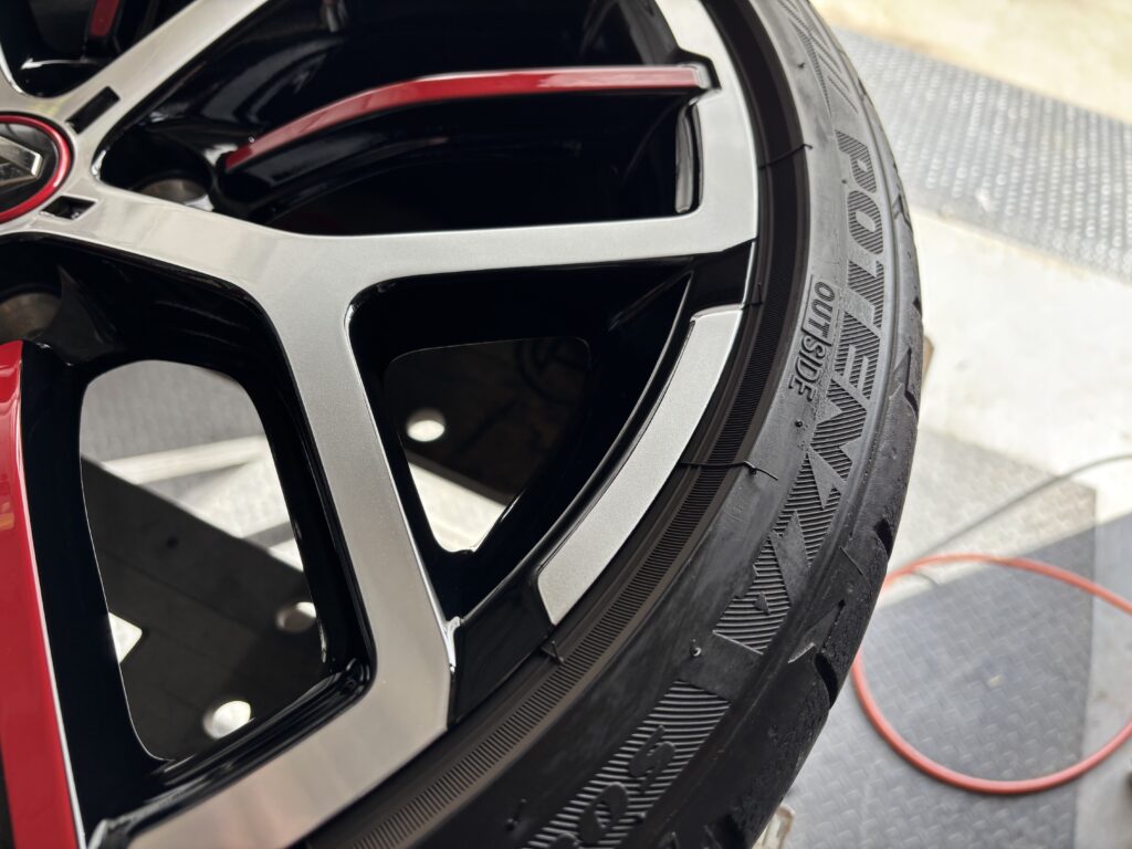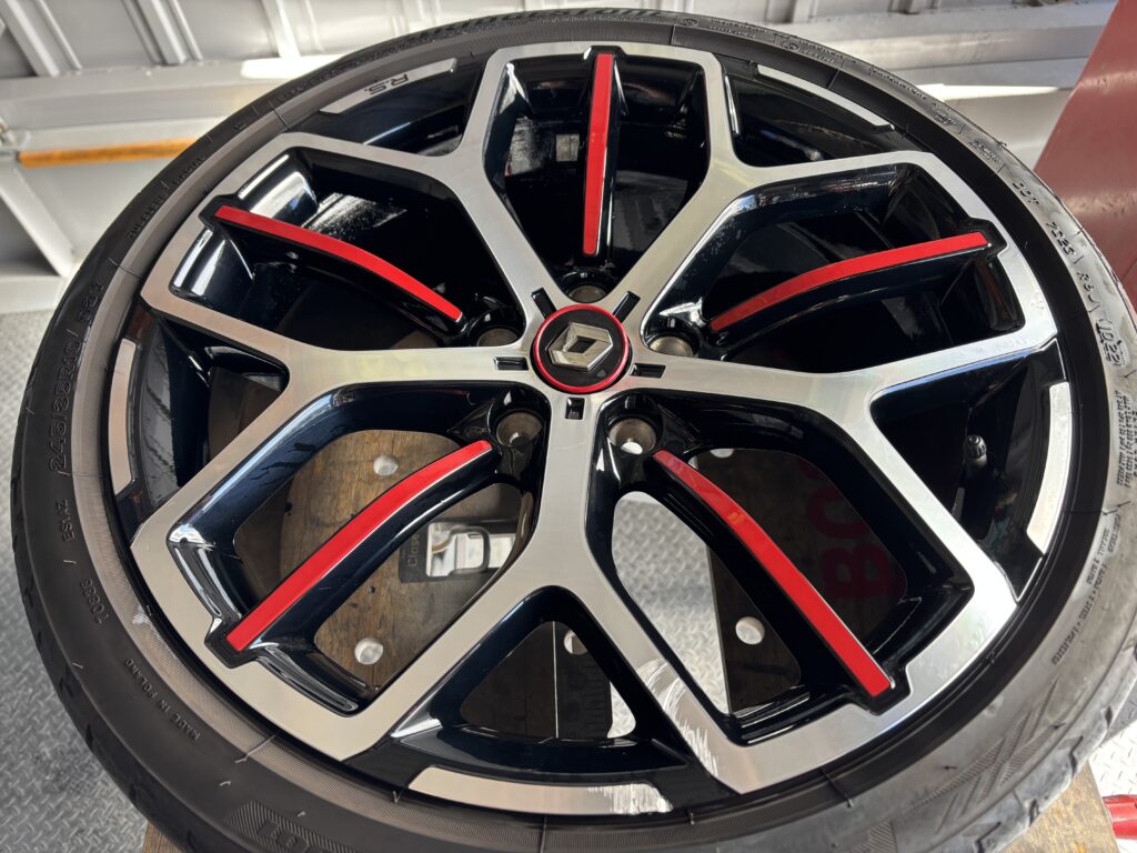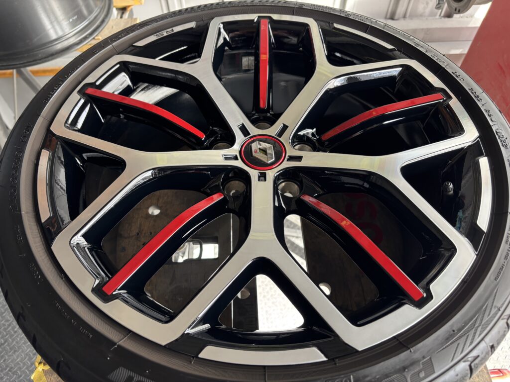 本日はルノー メガーヌR.S.トロフィーの純正アルミホイールガリキズをアルミ用硬化パテを充填してブラック塗装&ポリッシュ塗装でリペアさせていただきました。