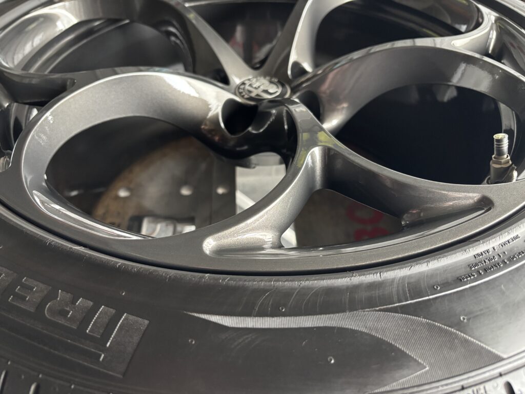 本日はアルファロメオ・ステルヴィオ クアドリフォリオの純正アルミホイールガリキズ をアルミ用硬化パテを充填してガンメタ塗装でリペアさせていただきました。