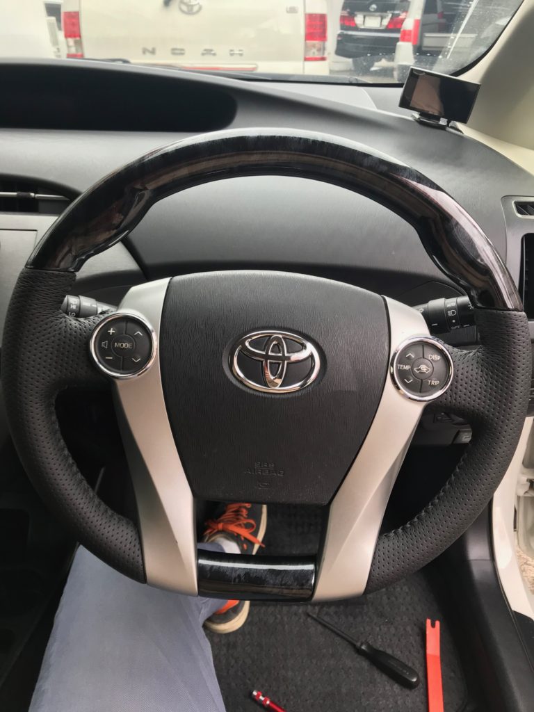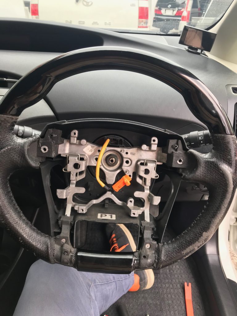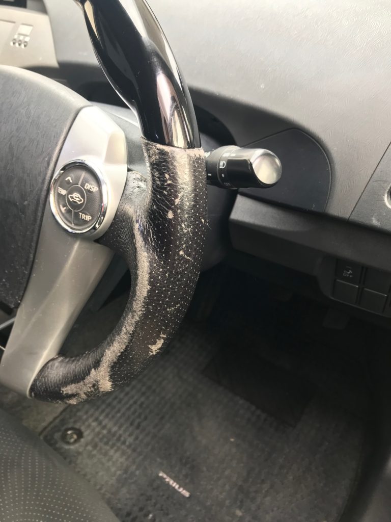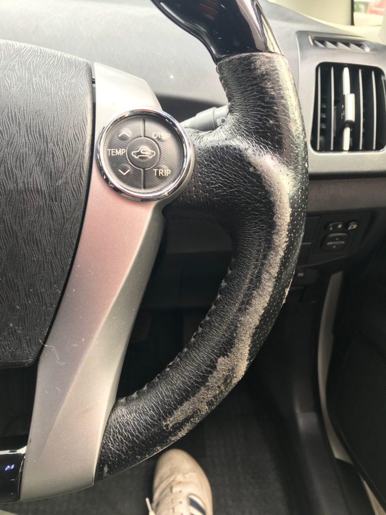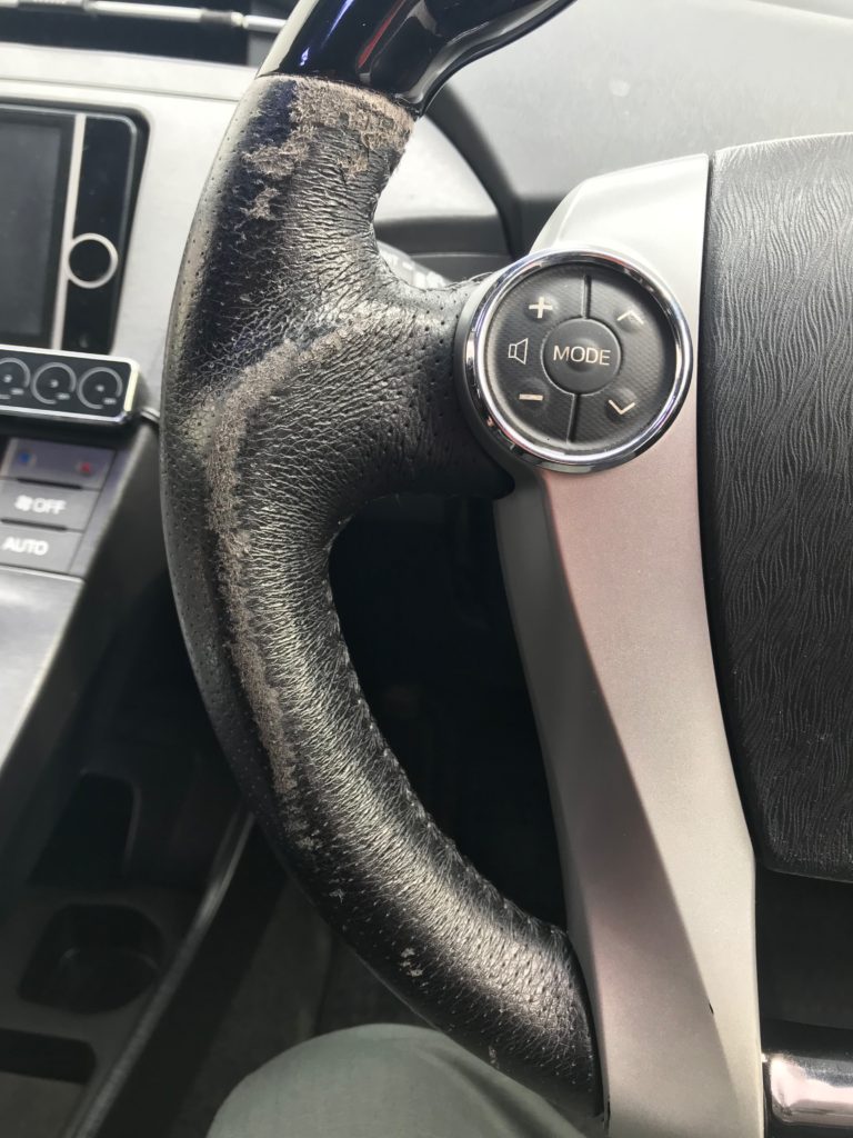 パンチングレザーのステアリングで、かなりひどい状態です。リペアでパテと塗装でパンチング部が埋まり、見栄えが悪くなってしまう事をお伝えしました。リペア料金を計算すると新品で購入した場合の料金と大差がないため新品での交換をおすすめしました。