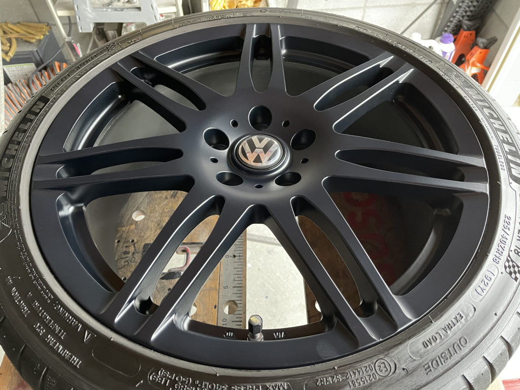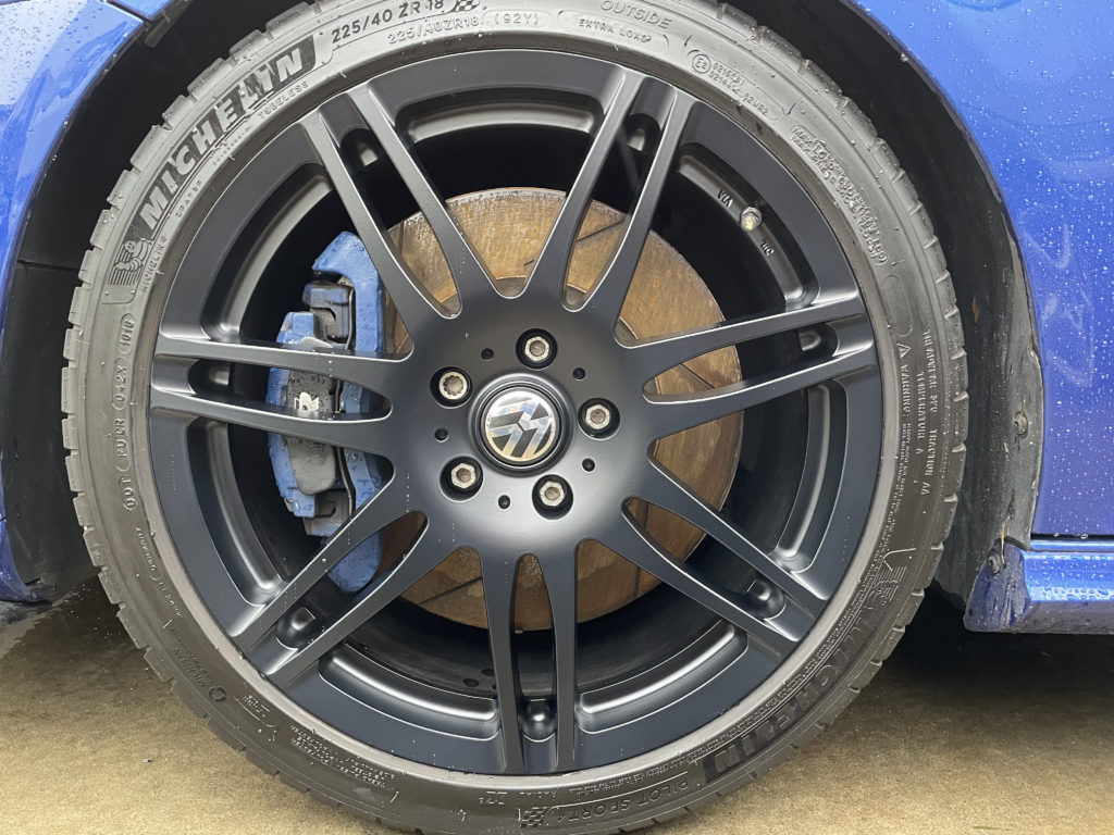 CRAFTS505の施工実績をご覧いただきありがとうございます、本日はフォルクスワーゲン・ゴルフR32のホイールガリキズをマットブラック塗装でリペアさせていただきました。