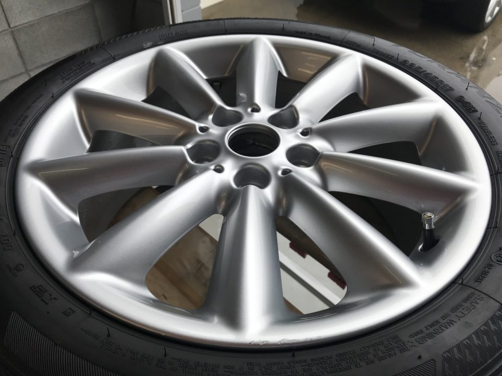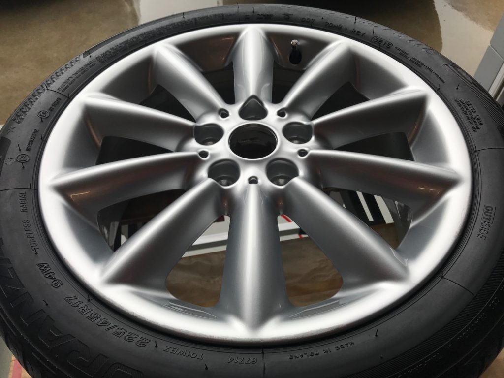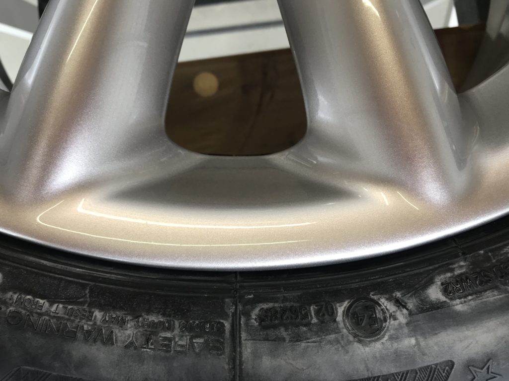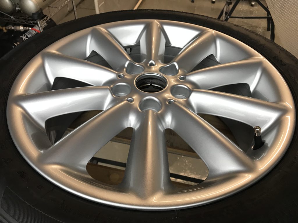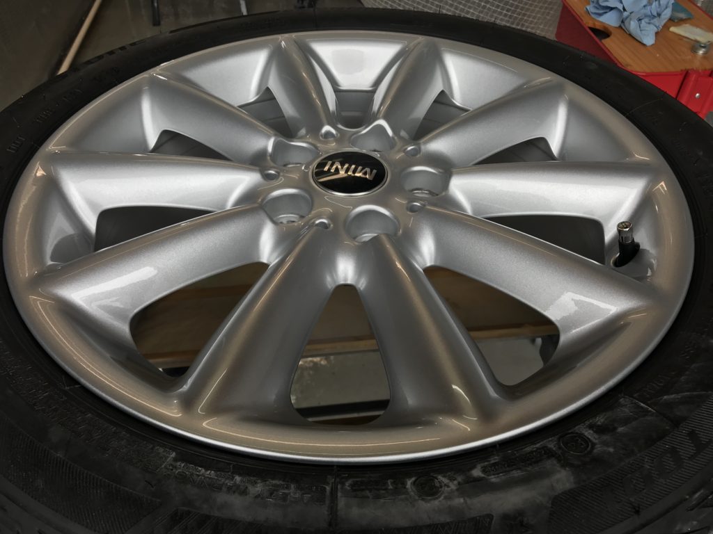 本日のリペアはミニクパークラブマン 純正ホイール3本になります、全数キズは浅いため整形後シルバー塗装で施工して行きます。
