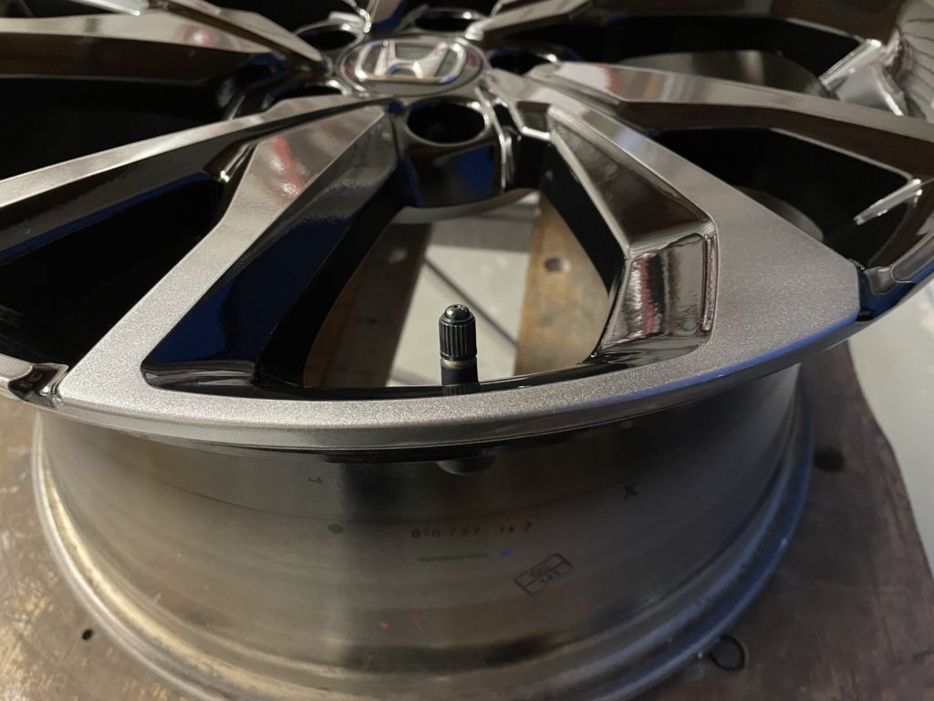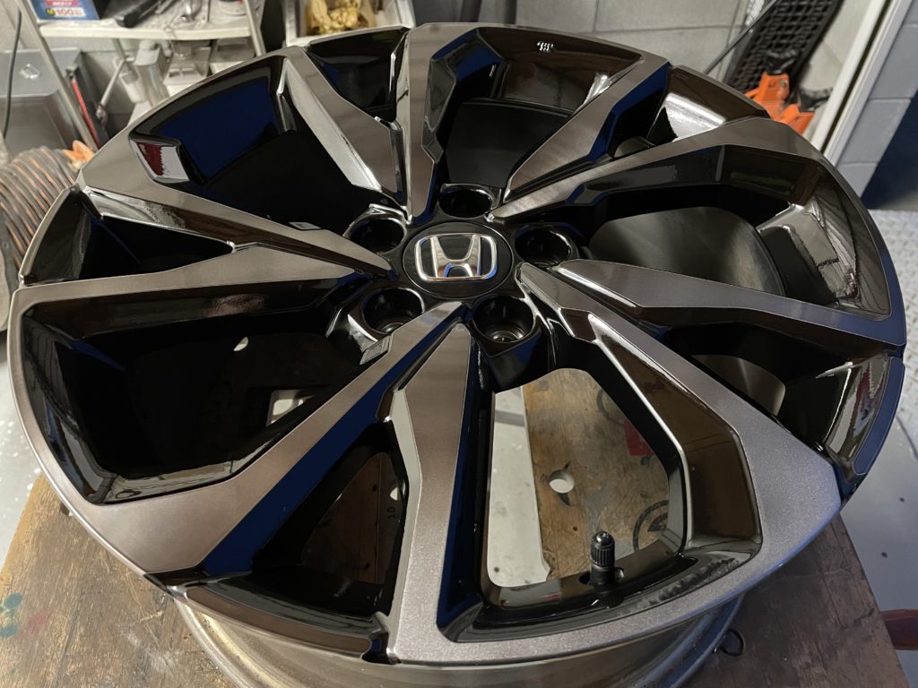 CRAFTS505の施工実績をご覧いただきありがとうございます、本日はホンダシビック純正ブラック/ダーク切削クリア仕上げのアルミホイールガリキズを硬化パテで整形を行い、ダーククリア風ポリッシュ塗装でリペアさせていただきました。