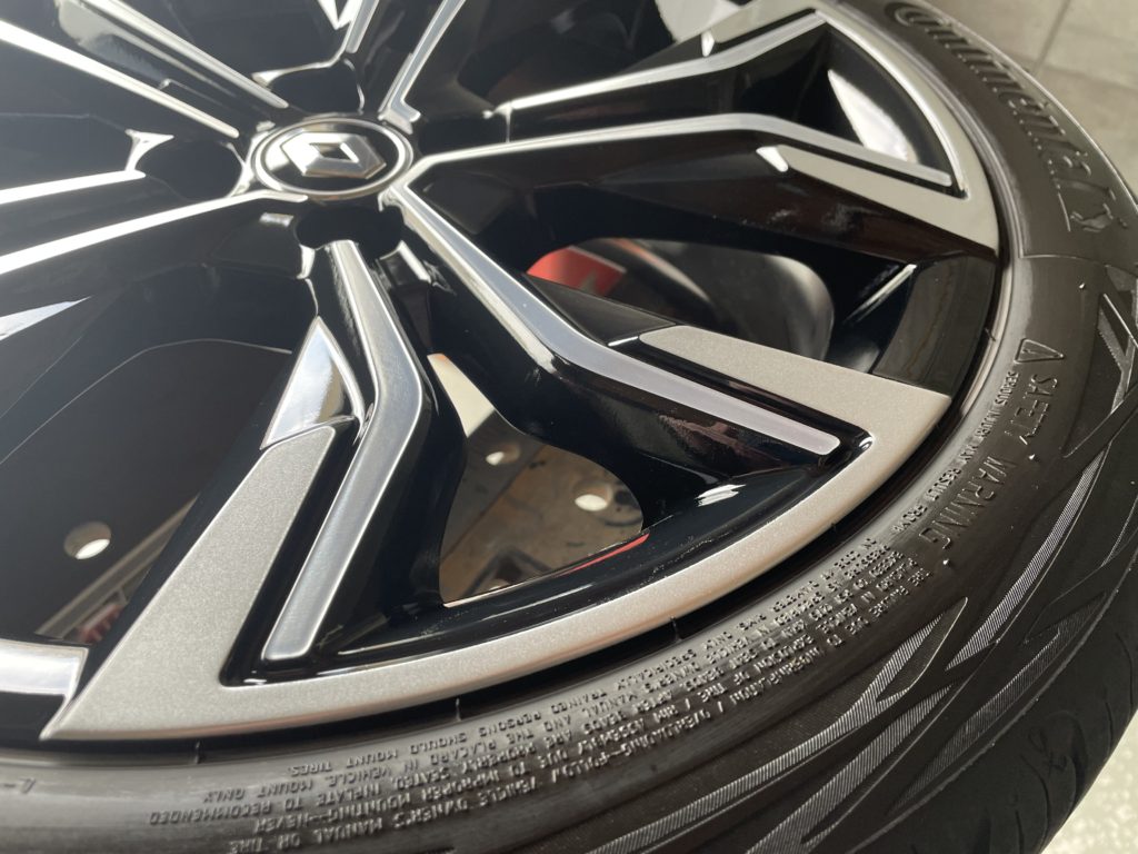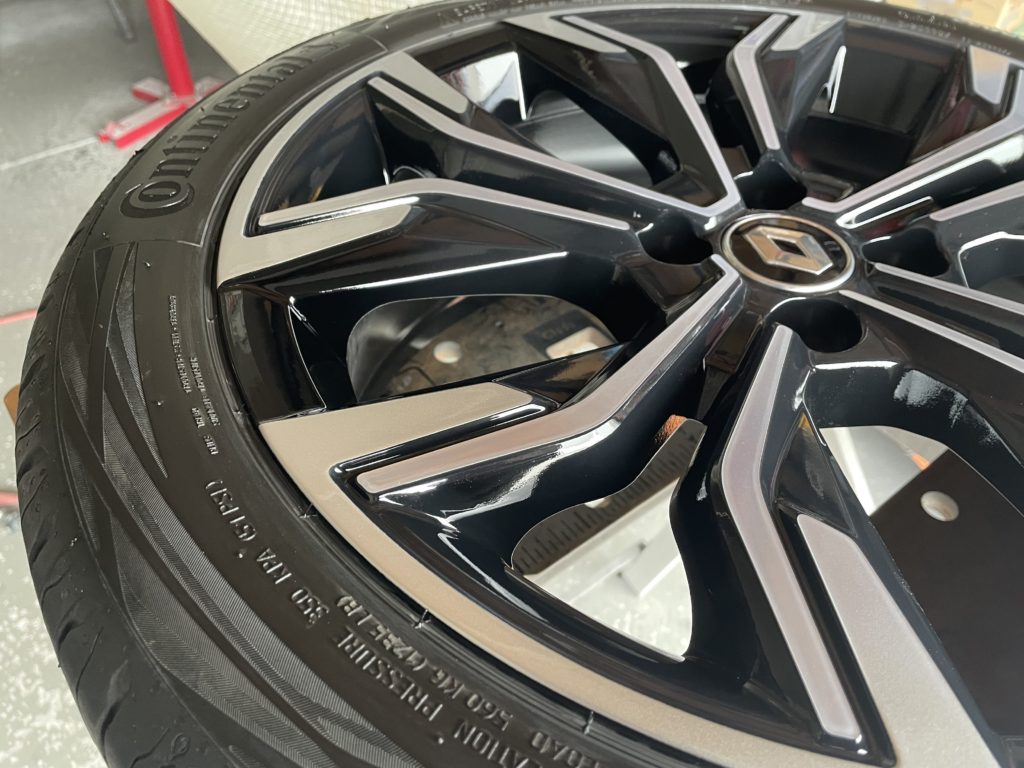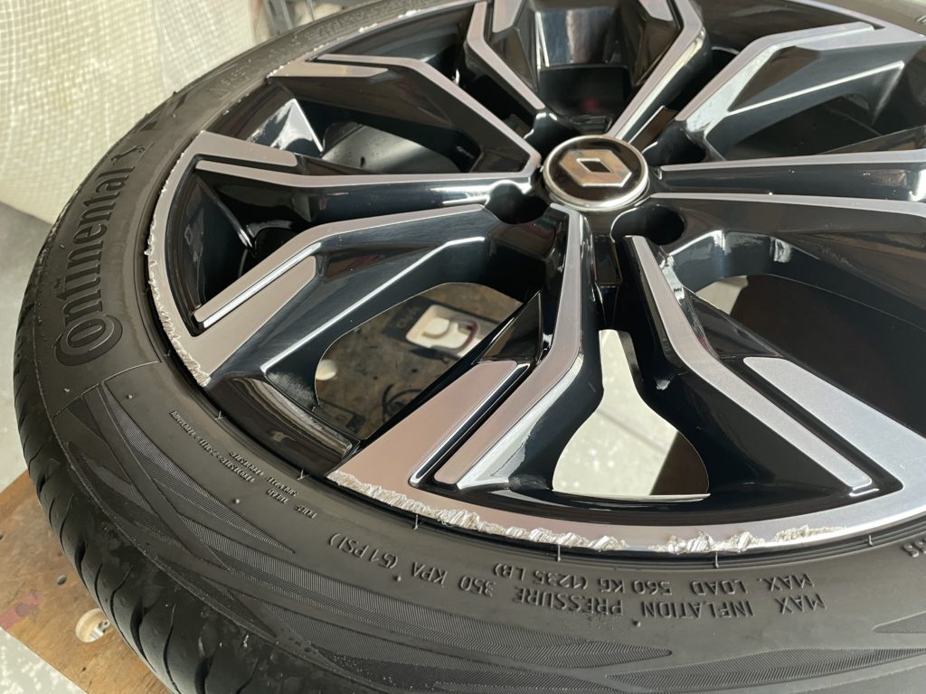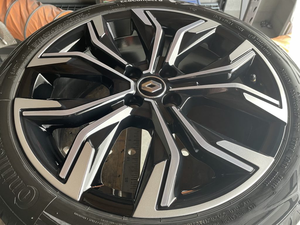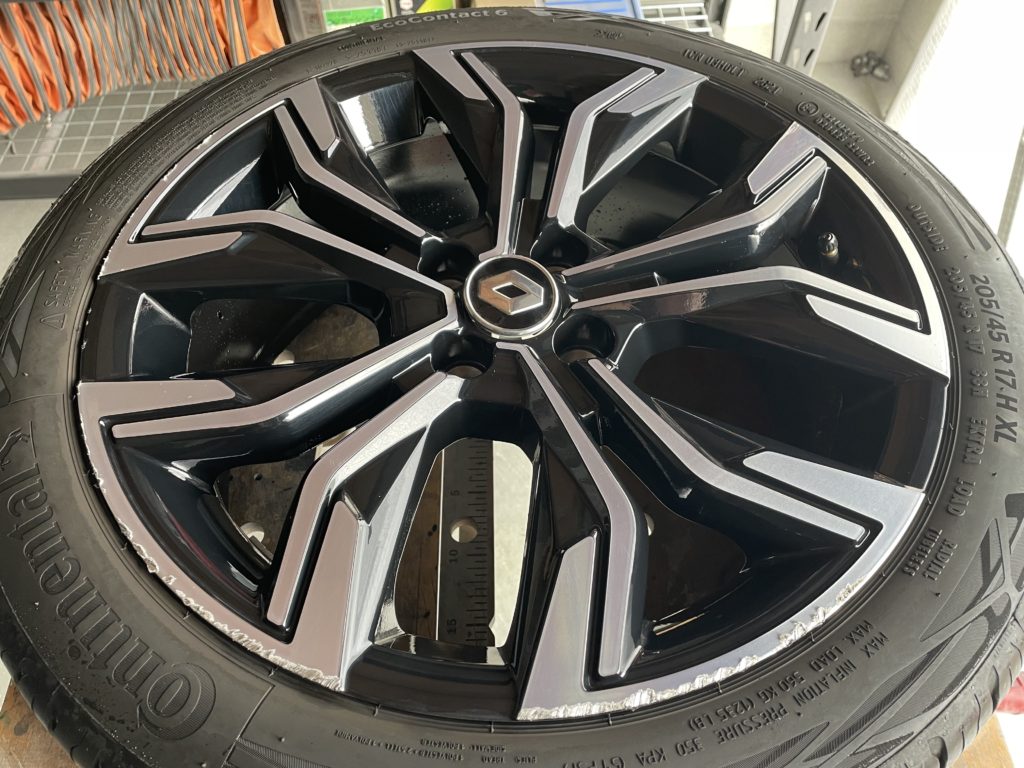 CRAFTS505(クラフツゴーマルゴ)の施工実績をご覧いただきありがとうございます、本日はルノールーテシアの純正ブラック/ダイヤモンドカットポリッシュホイールガリキズ を硬化パテを使いポリッシュ塗装とブラック塗装でリペアしました。