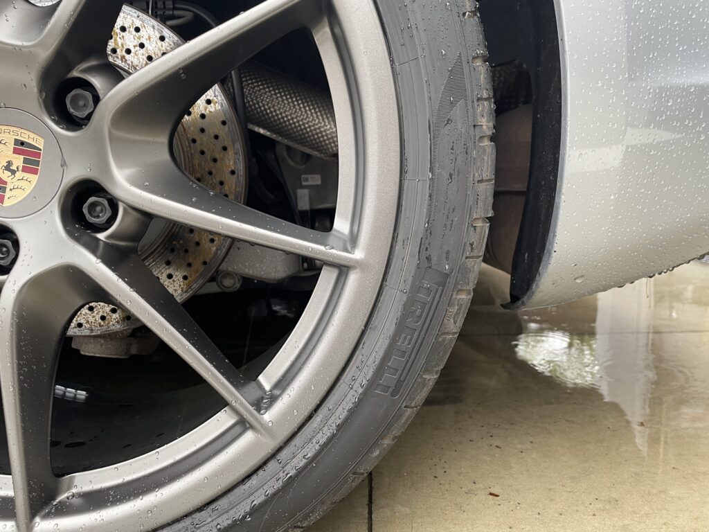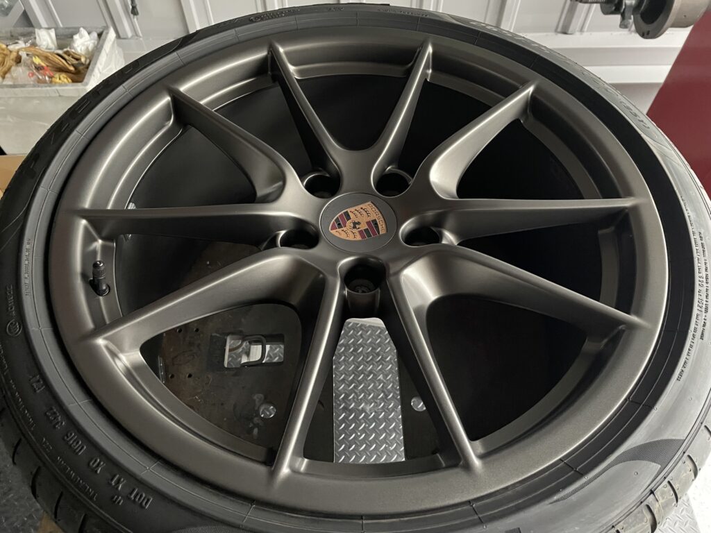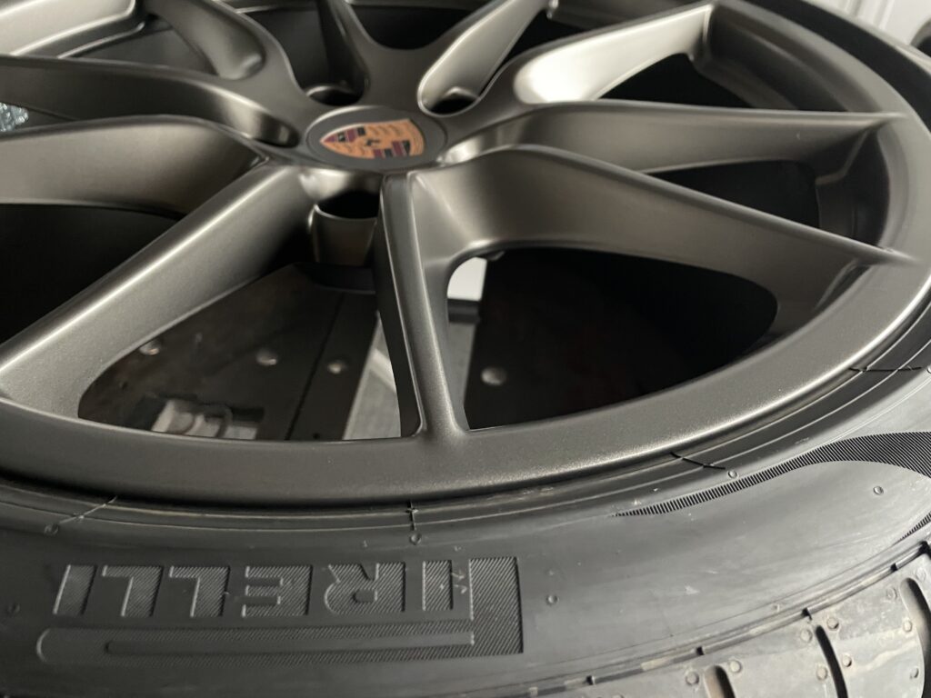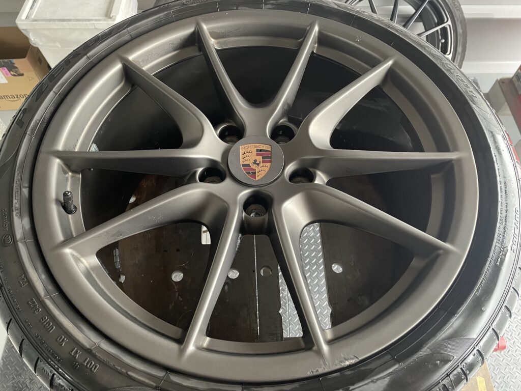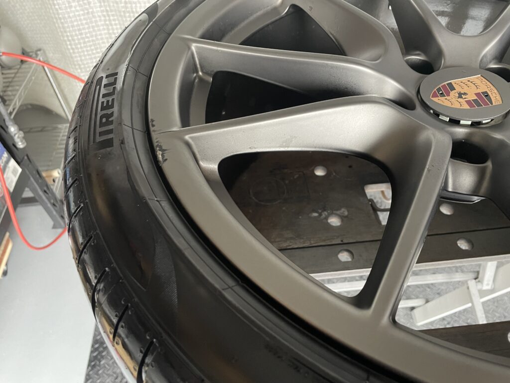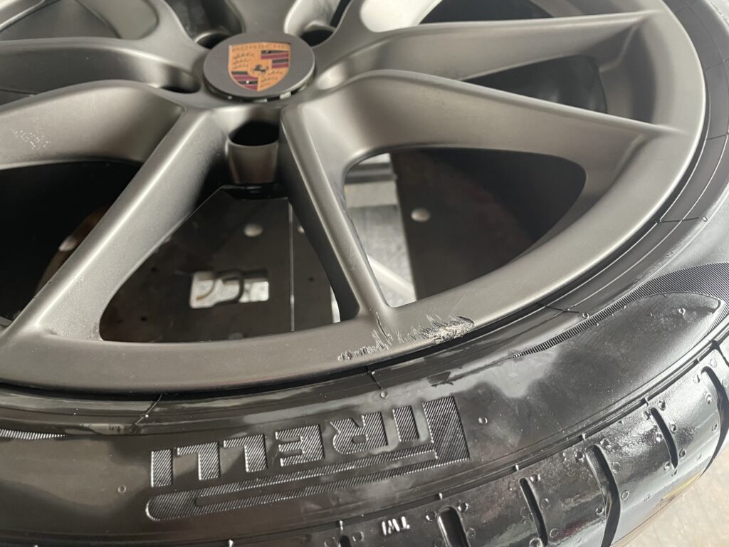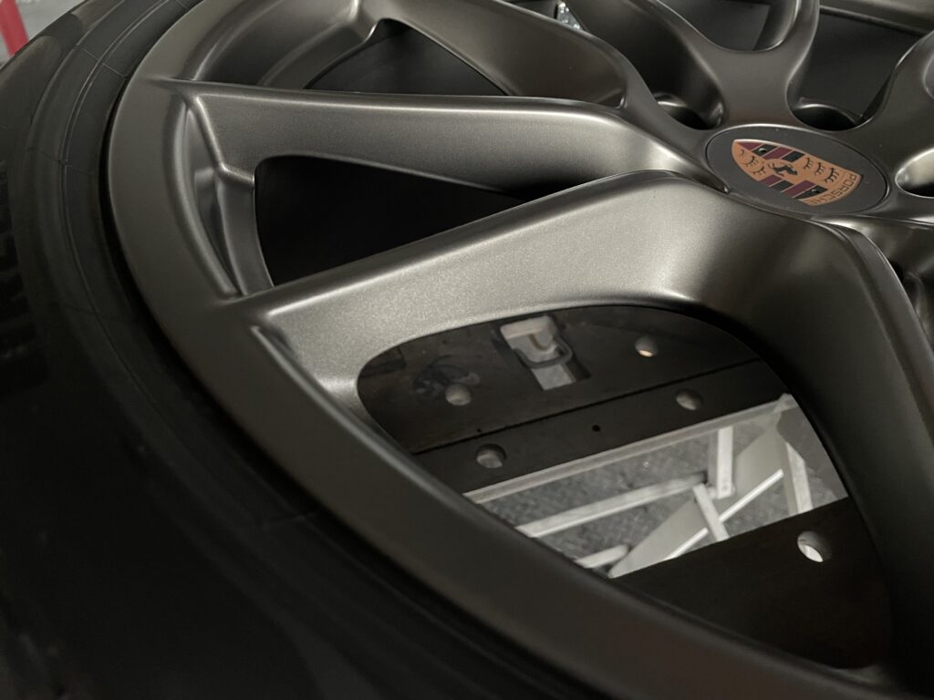 本日はポルシェケイマンSの純正アルミホイールガリキズをマットガンメタ塗装でリペアさせていただきました。