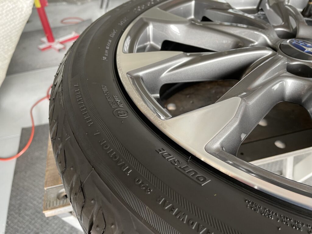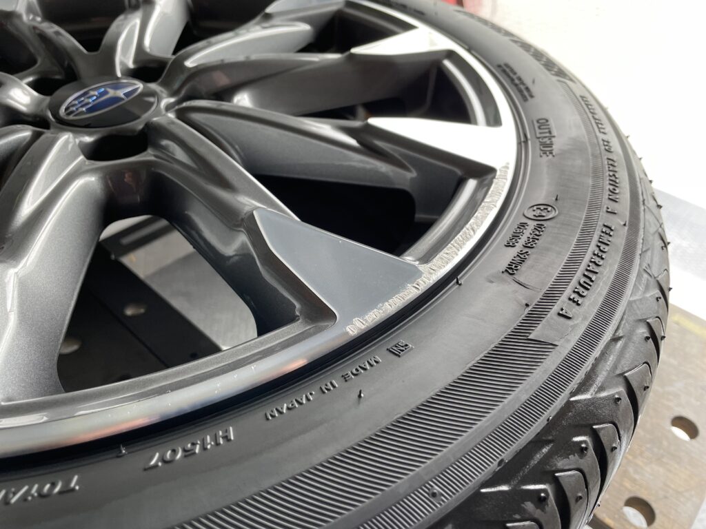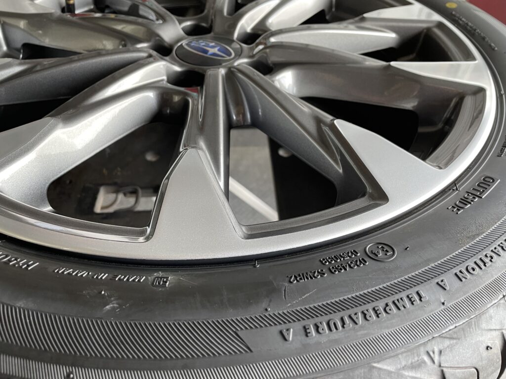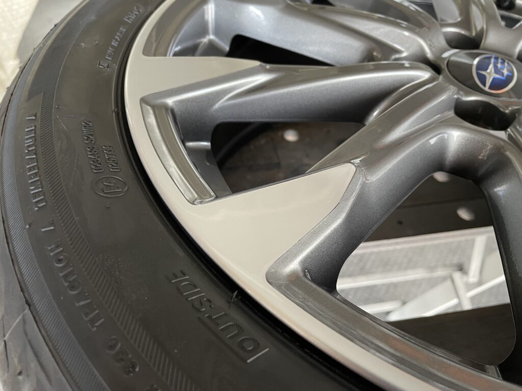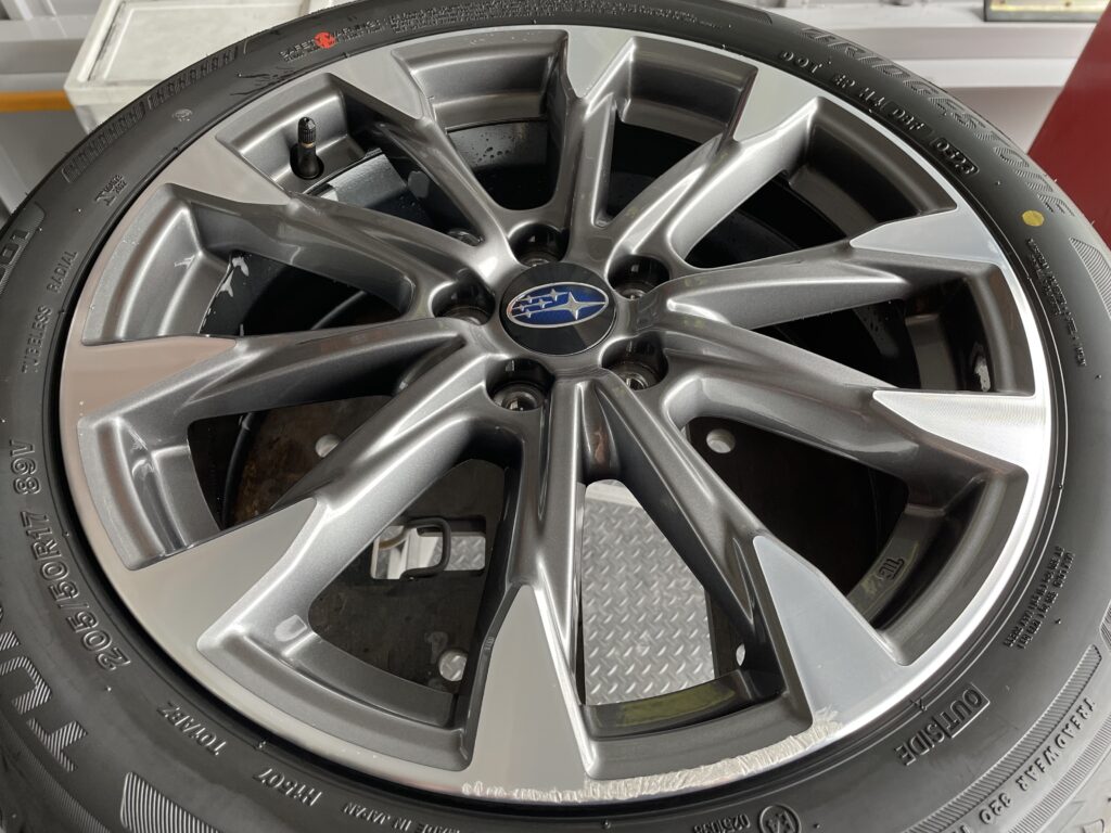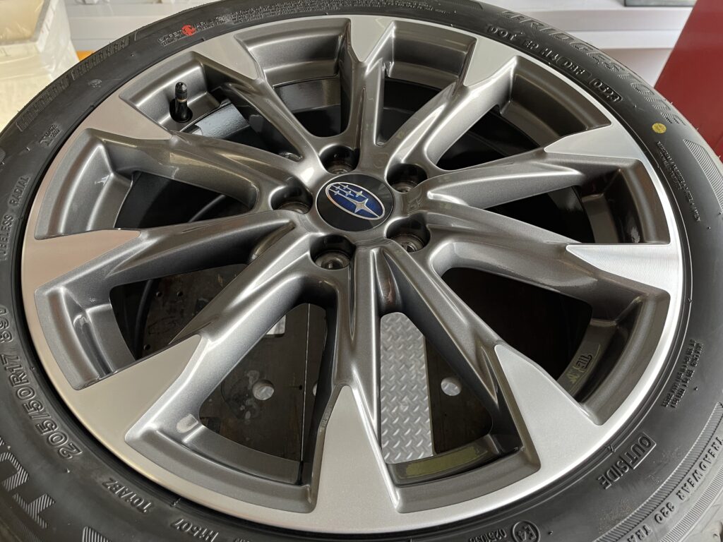 本日はスバルインプレッサの純正ガンメタ/ダイヤモンドカットポリッシュアルミホイールガリキズをポリッシュ塗装でリペアさせていただきました。