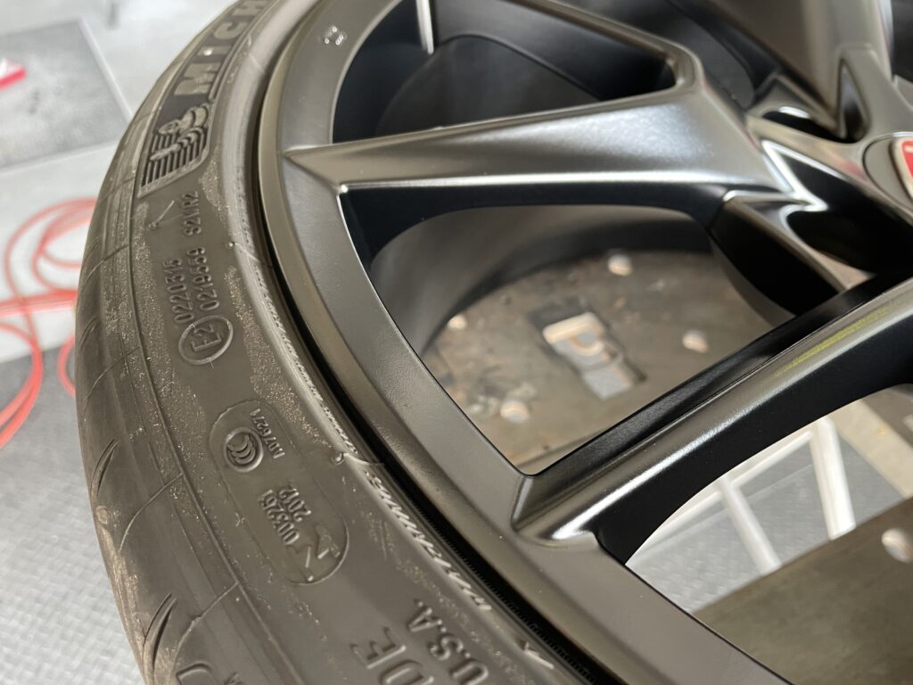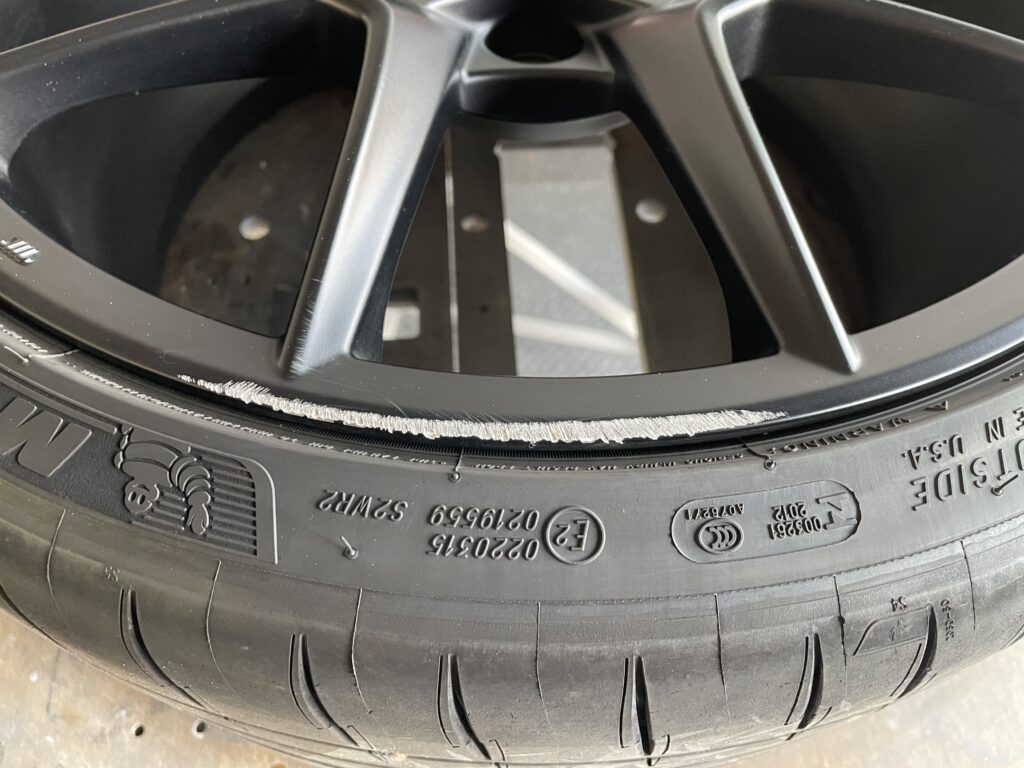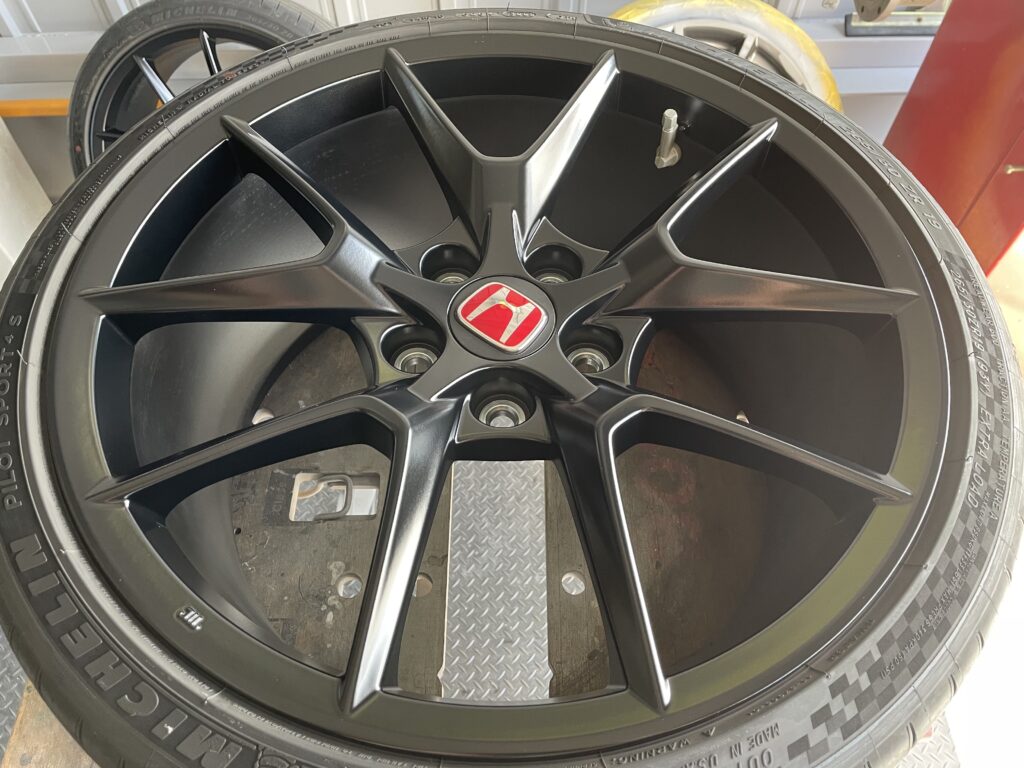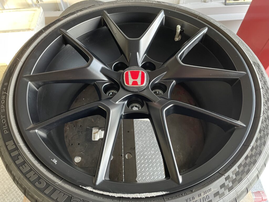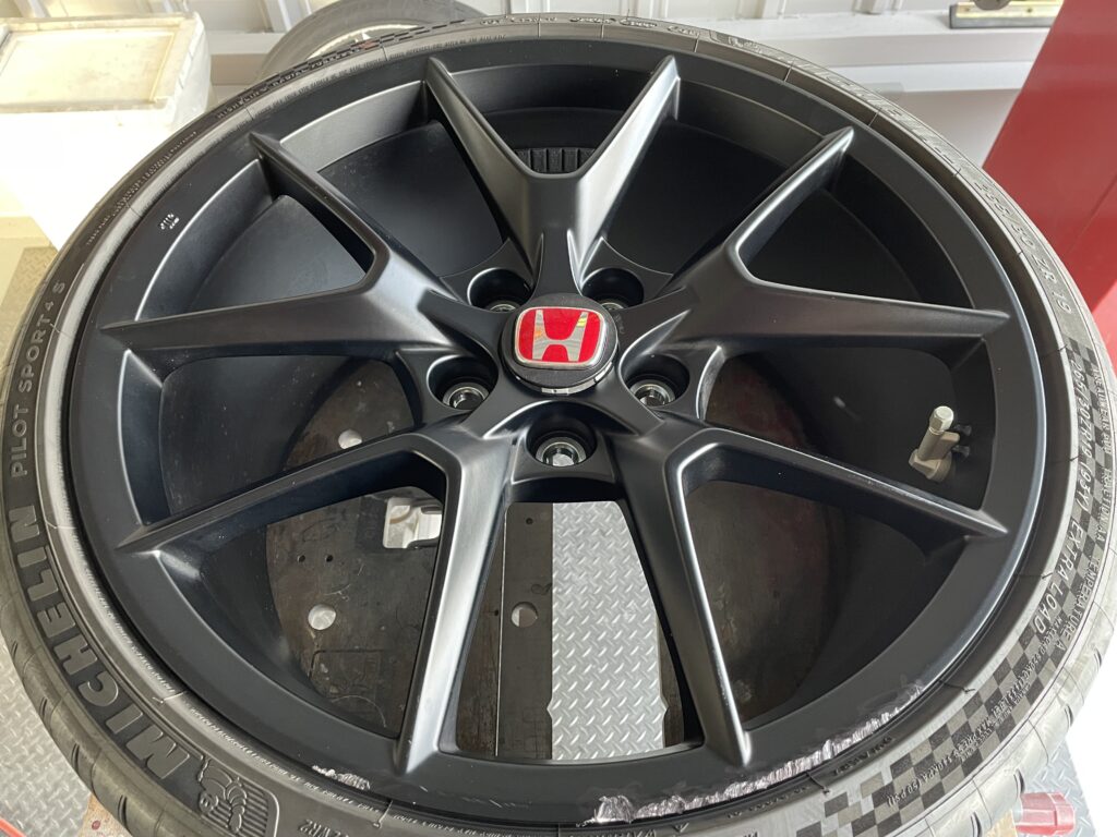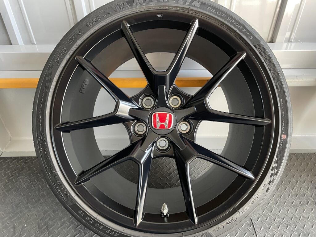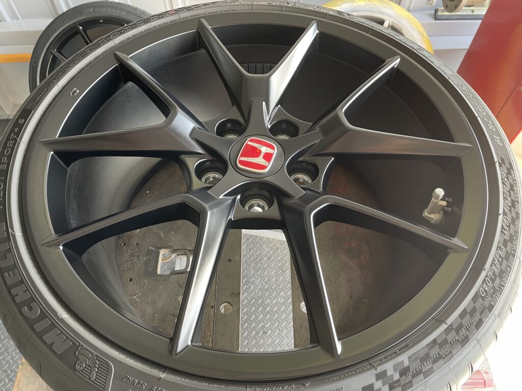 本日はホンダシビック タイプRの純正アルミホイールガリキズ2本をアルミ硬化パテを充填整形して、マットブラック塗装でリペアさせていただきました。