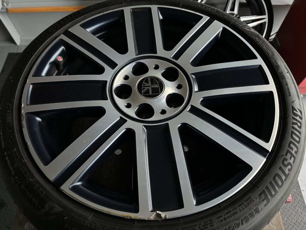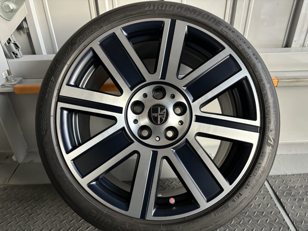 本日2件目もMINI専門店からのご依頼でマットブルー/ポリッシュアルミホイール抉れをアルミ溶接を加え切削機械で全面スライスカットで新品に近い状態になるようリペアさせていただきました。