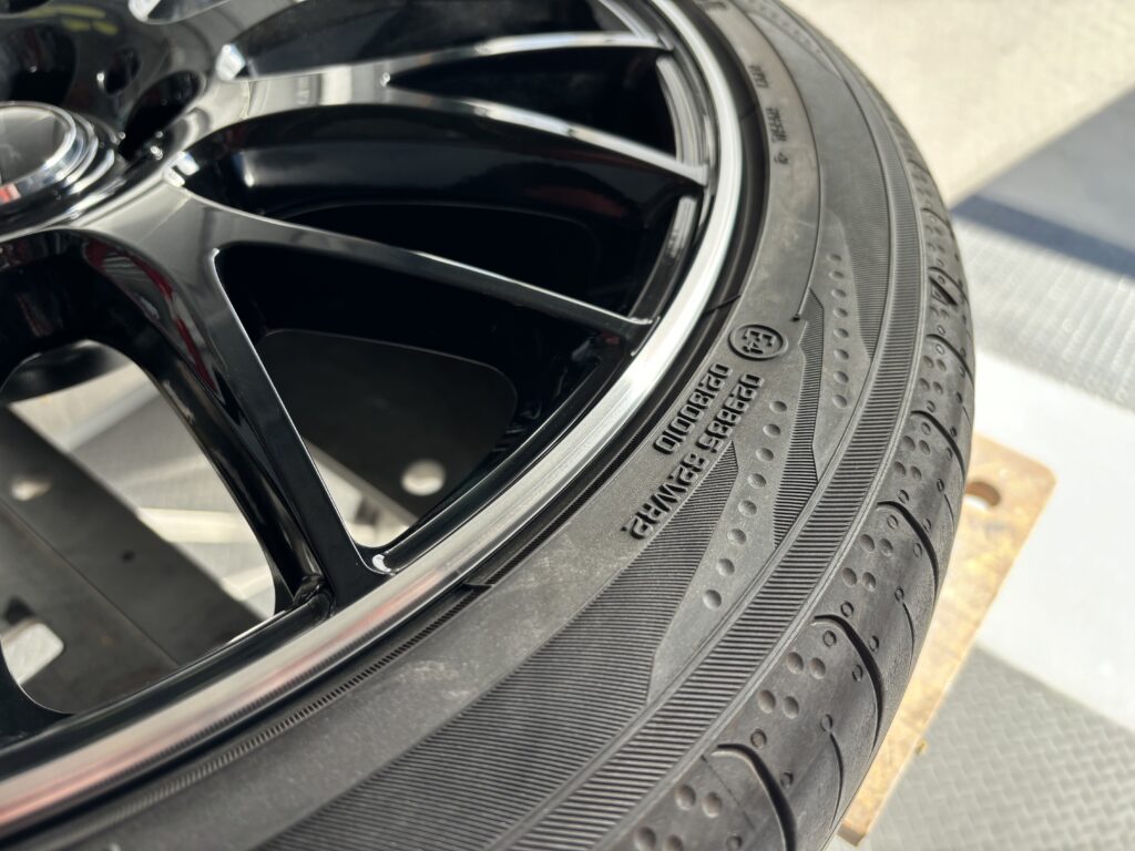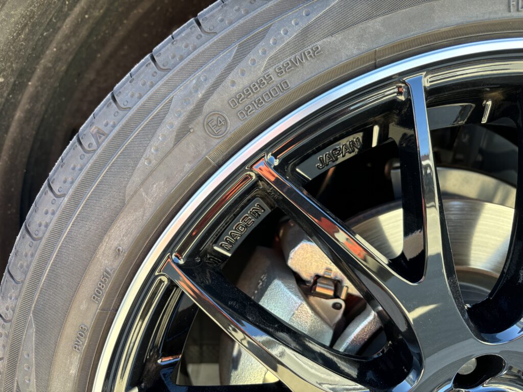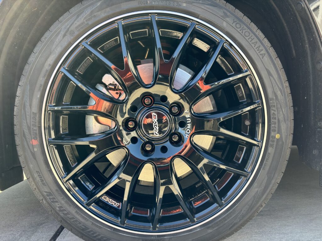 本日3件目の施工はトヨタ・ヴォクシーに装着のRAYS HOMURA2✖️9Plusのブラック/ポリッシュアルミホイールリムキズをリム全周切削研磨でリペアさせていただきました。