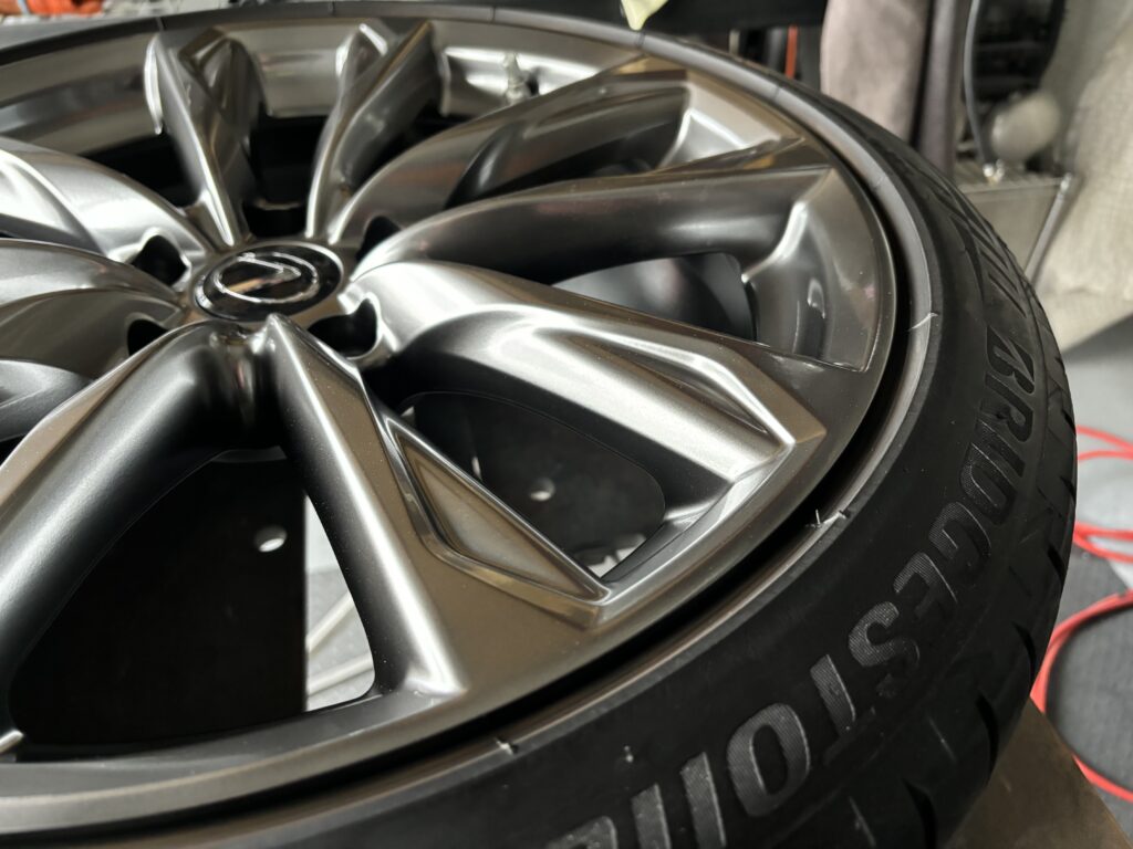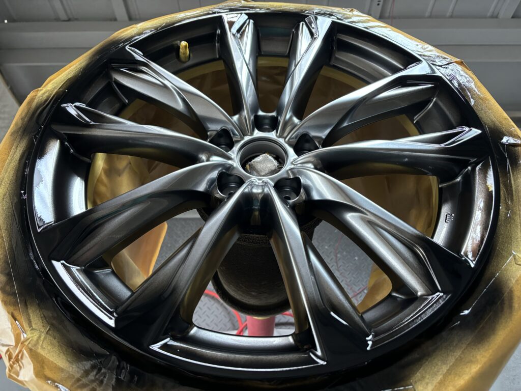 本日はレクサスIS300h”F SPORT”の純正アルミホイールガリキズをスーパーグロスブラックメタリック塗装でリペアさせていただきました。
