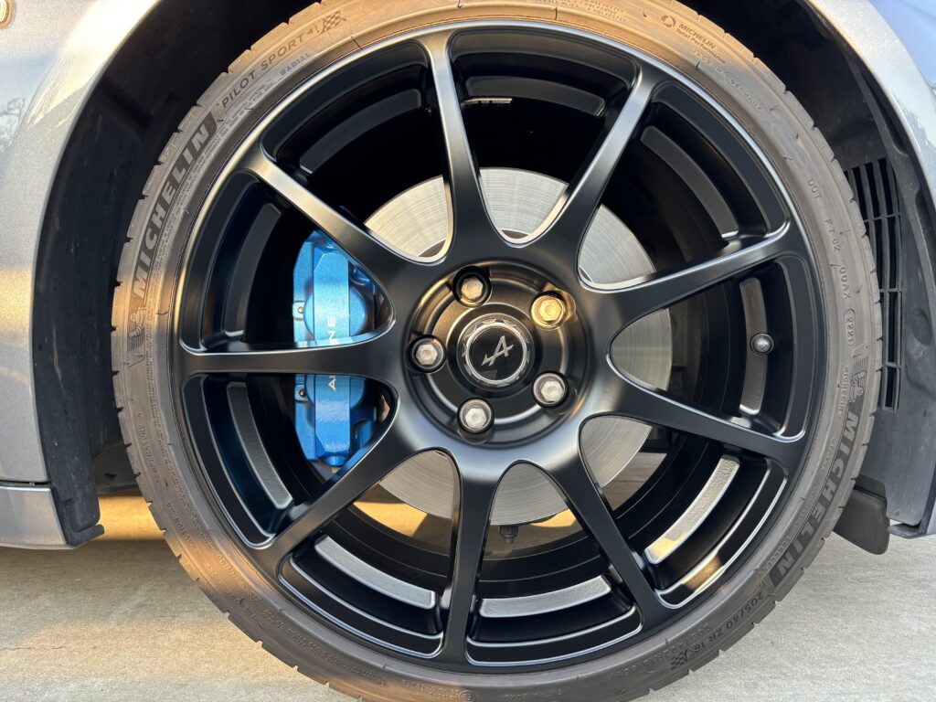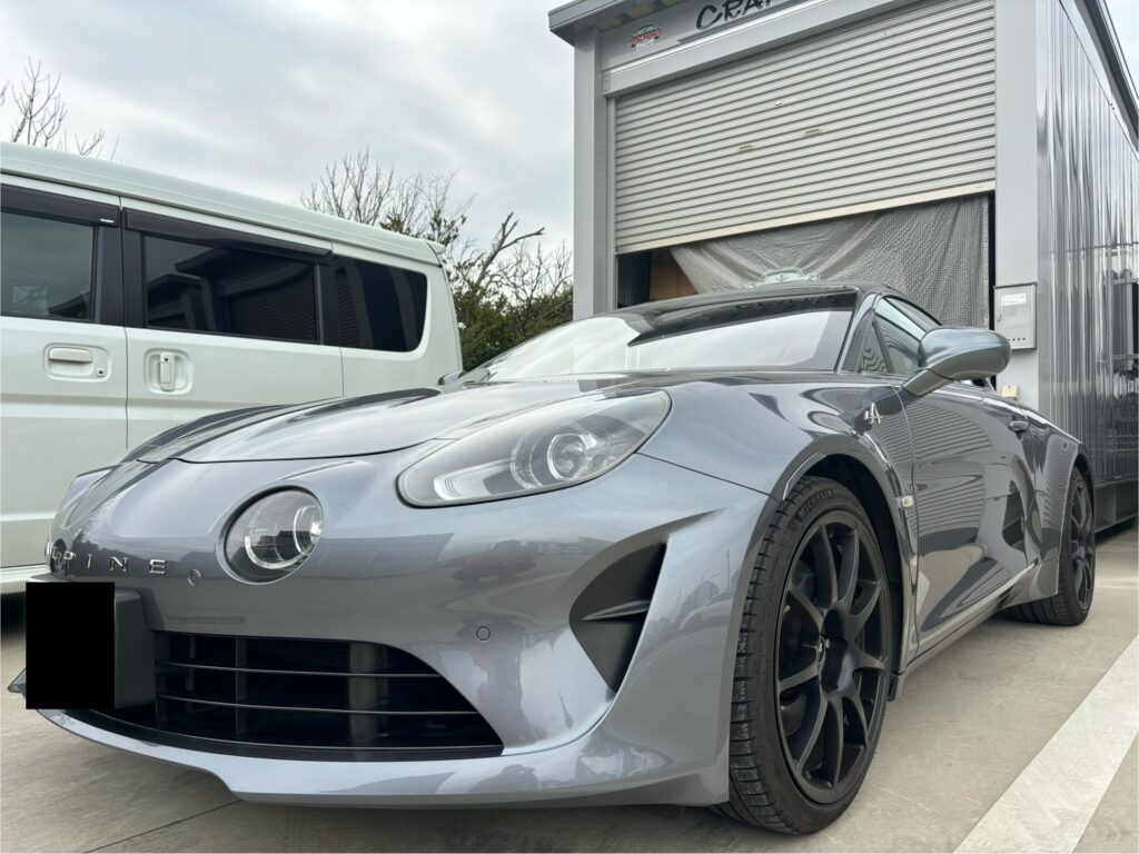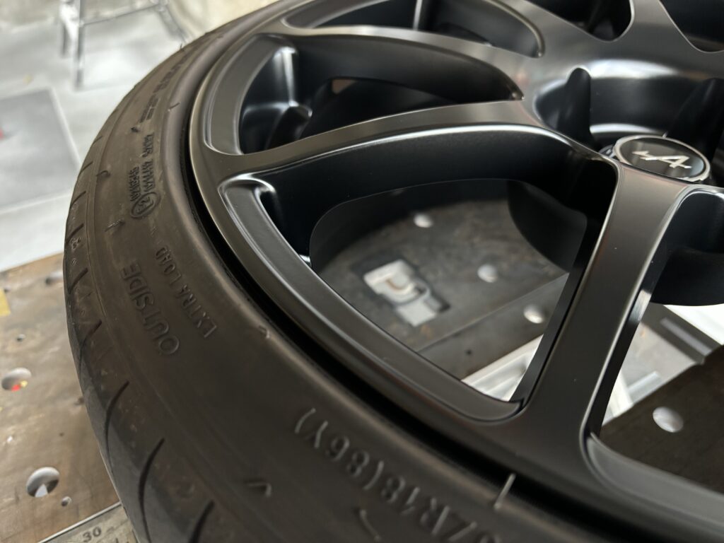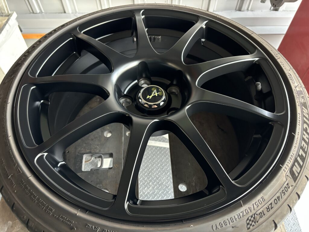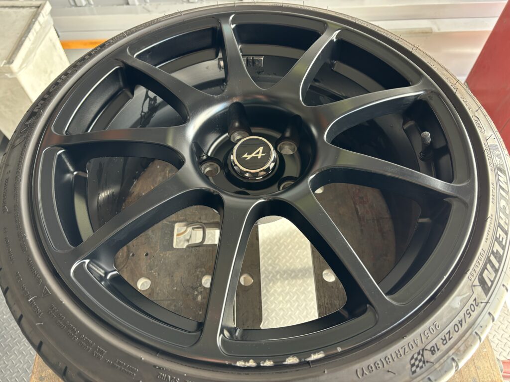 本日はALPINE A110GTの純正アルミホイールガリキズをマットブラック塗装でリペアさせていただきました。