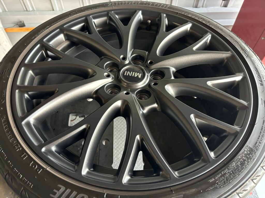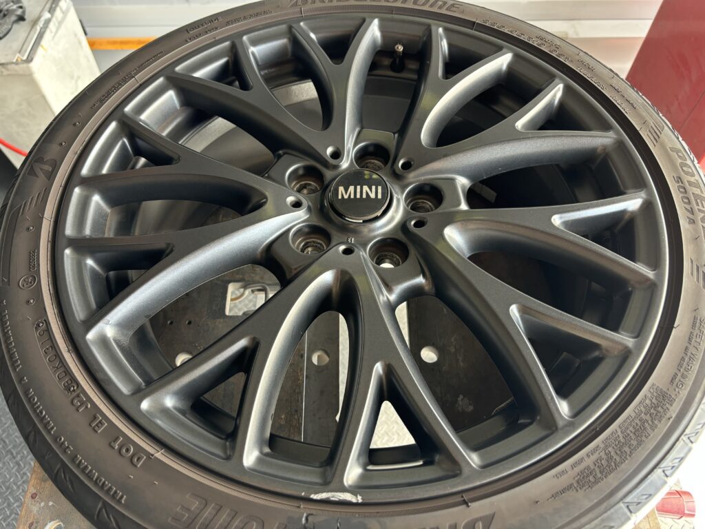 本日はミニクロスオーバー ジョン クーパー ワークスの純正アルミホイールガリキズ をマットガンメタ塗装でリペアさせていただきました。