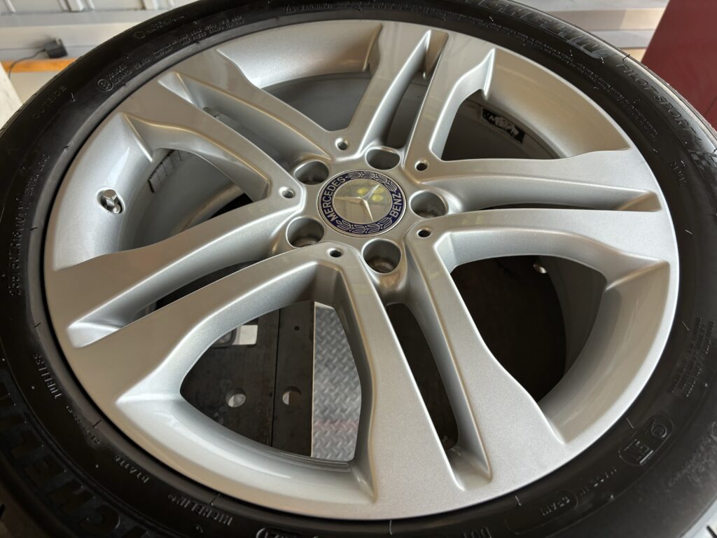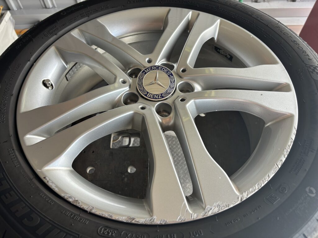本日はメルセデス・ベンツGLA250の純正アルミホイールガリキズ をシルバー塗装でリペアさせていただきました。