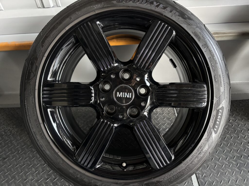 本日はミニクーパーSの純正アルミホイールガリキズをブラック塗装でリペアさせていただきました。