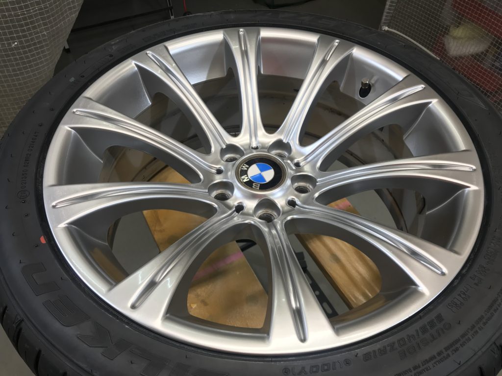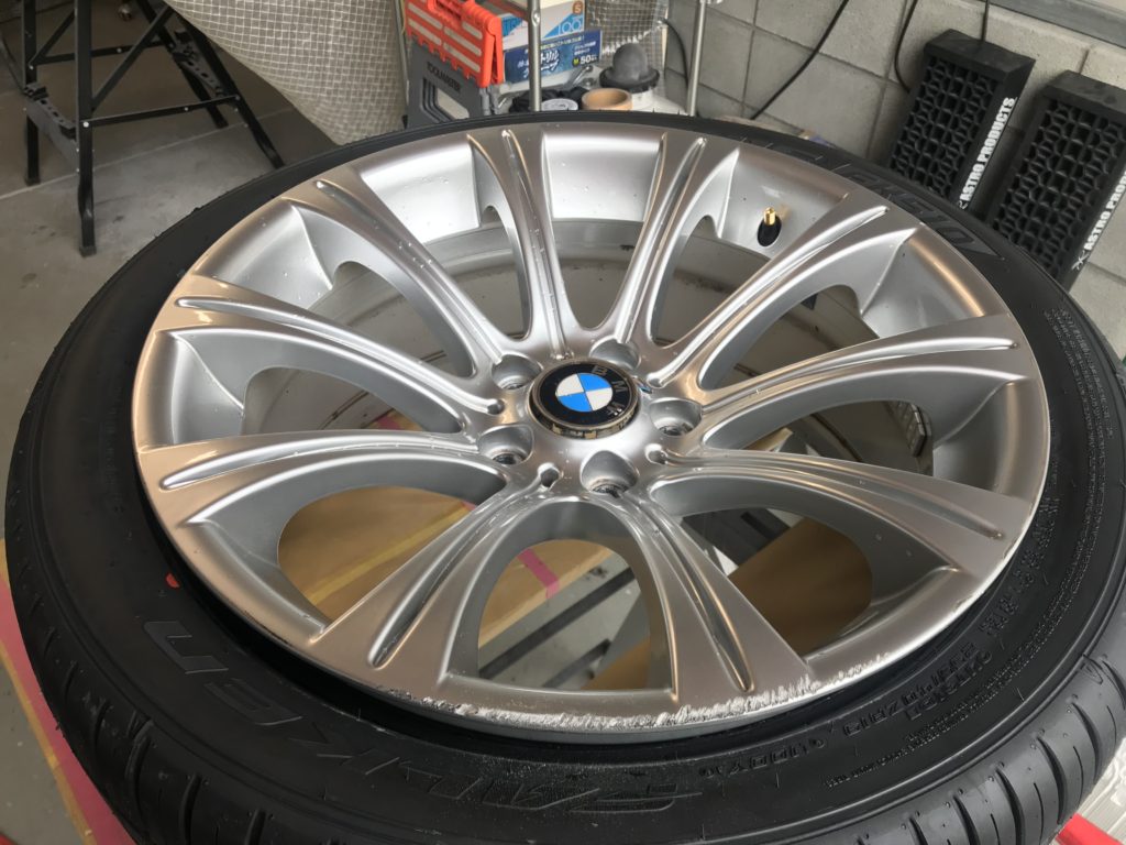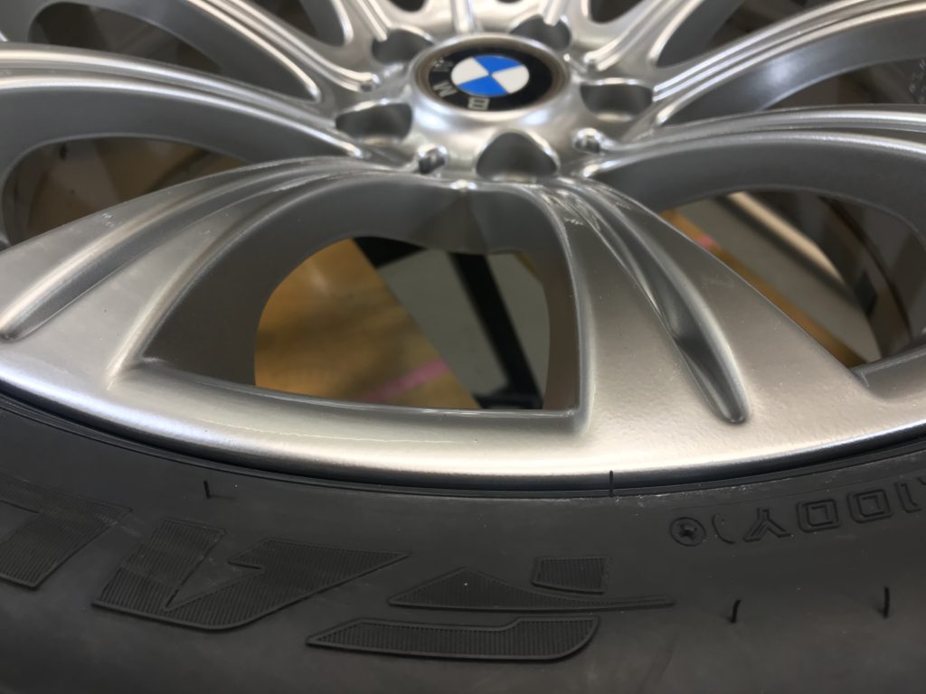 V型10気筒500馬力のハイパワーモデルのE60型M5の純正ホイールリペアになります。ハイパーシルバーホイールなので下地色を入れてハイパー塗装でリペアしました。