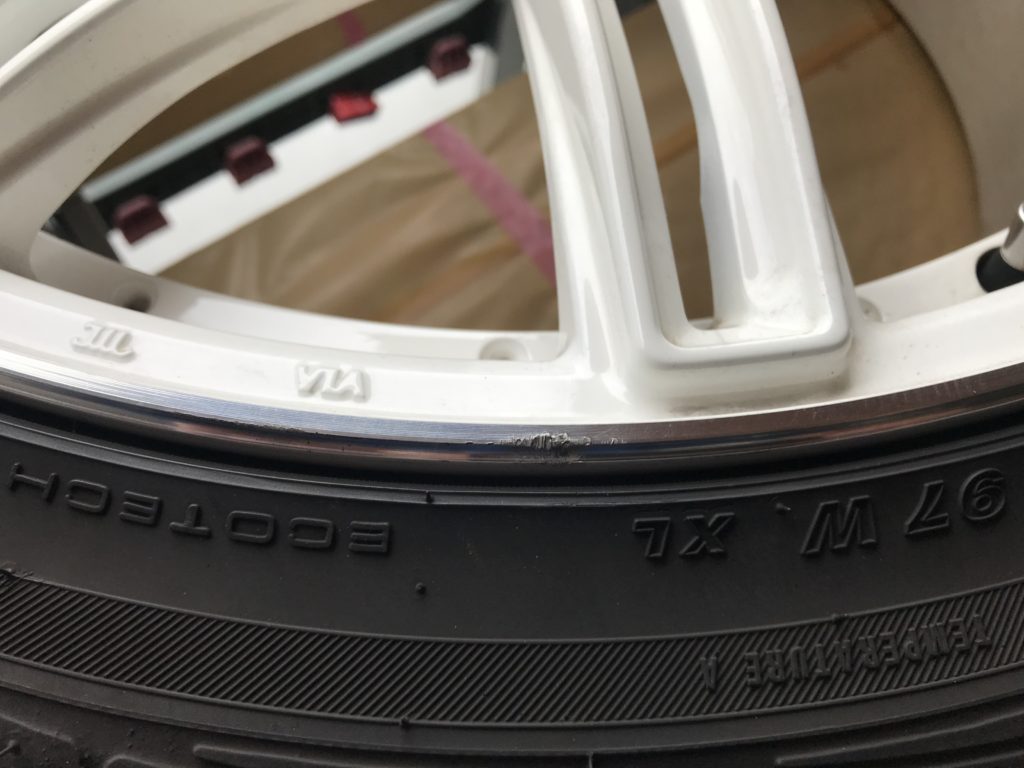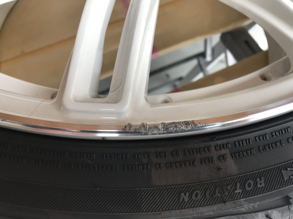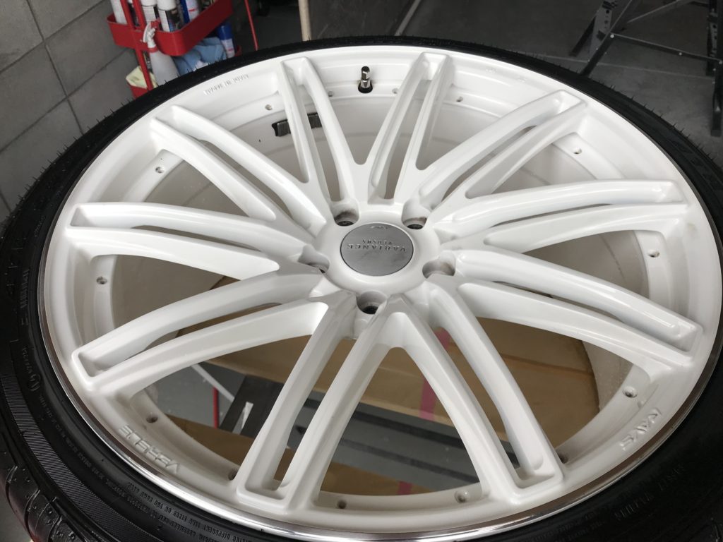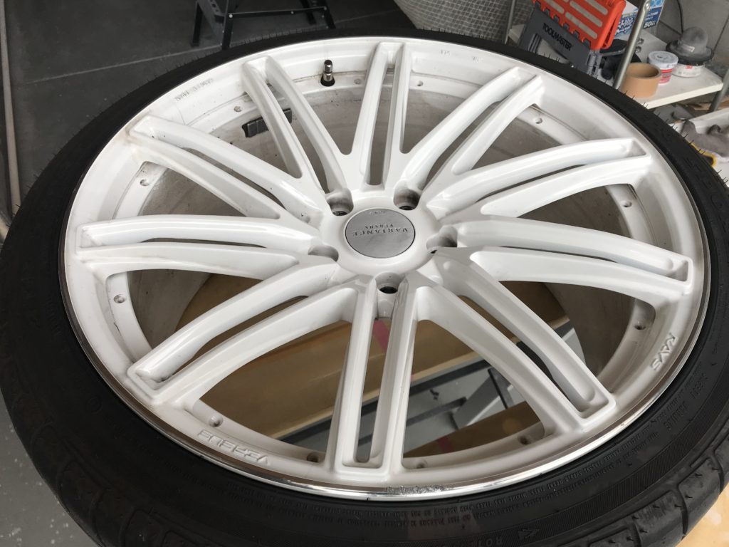 以前リペアさせていただいた方から前回同様のリムキズ修理のご依頼をいただきました。レイズの20inchでホワイトに塗装されたホイールになります。