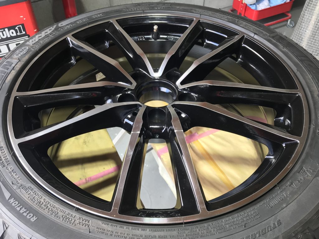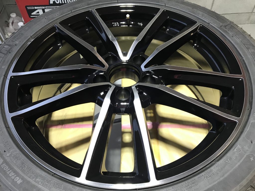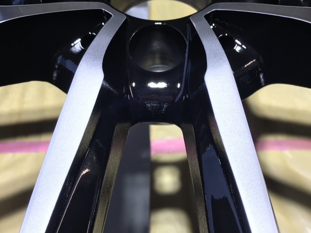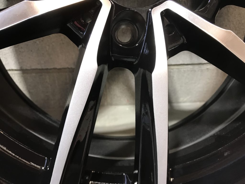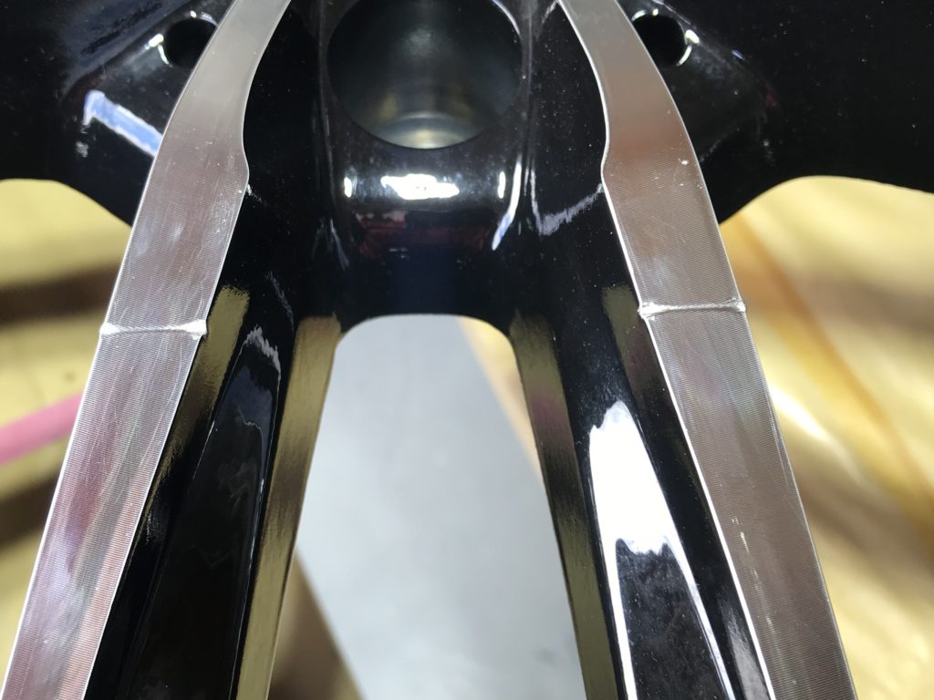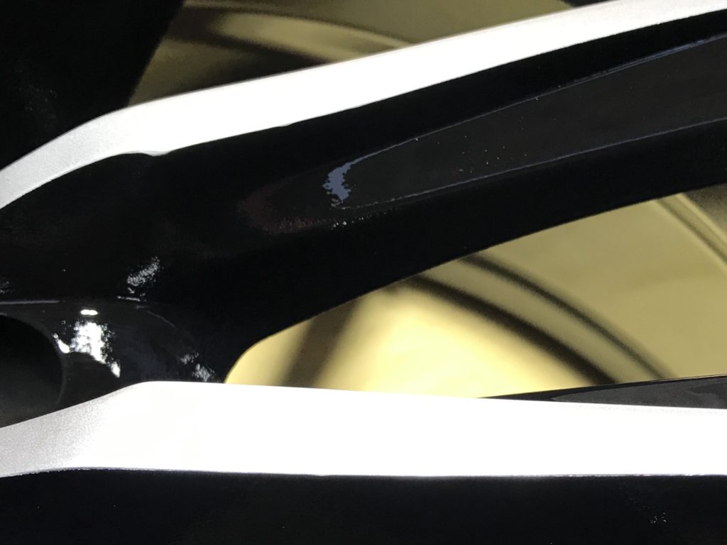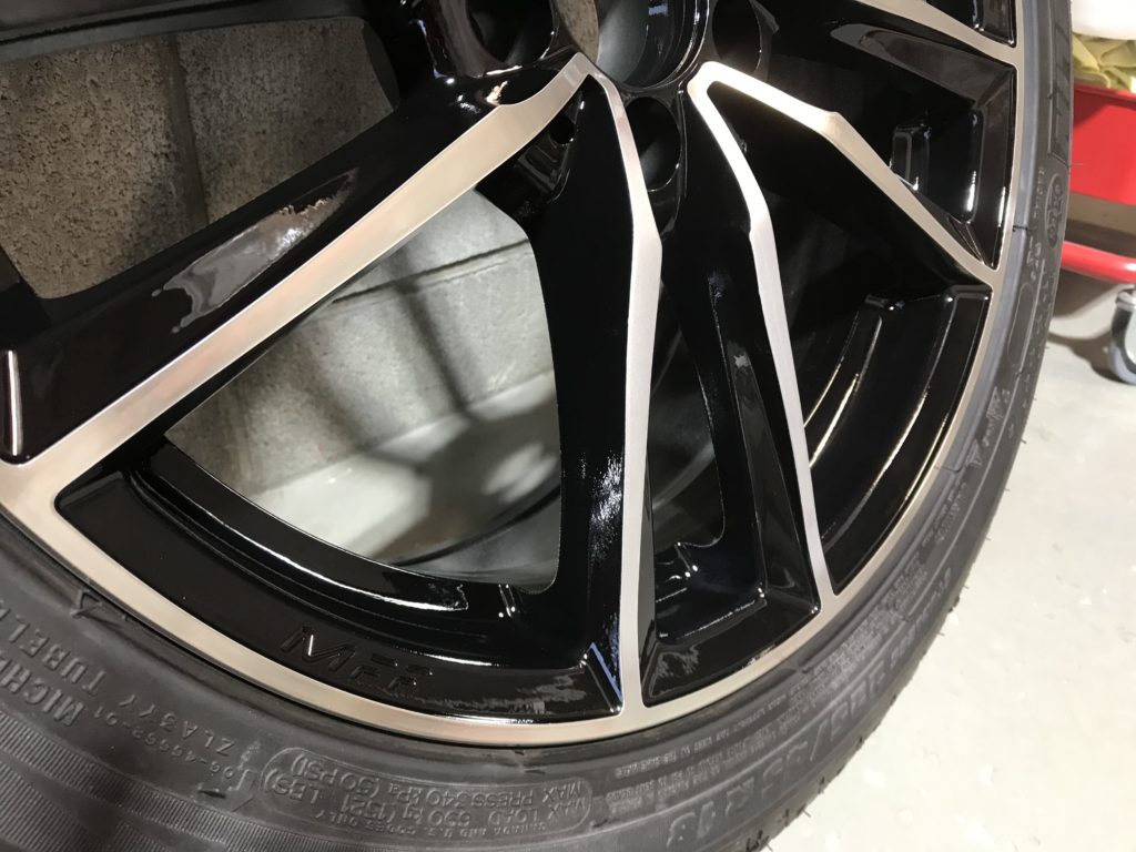 本日から通常営業となり、早速業者様からお仕事をいただき施工させていただきました。ホイールはMFFの5本ツインスポークのダイヤモンドカットホイールでスポーク部に浅いようで深いキズが2箇所ある状態です、整形してポリッシュ風塗装でリペアさせていただきました。