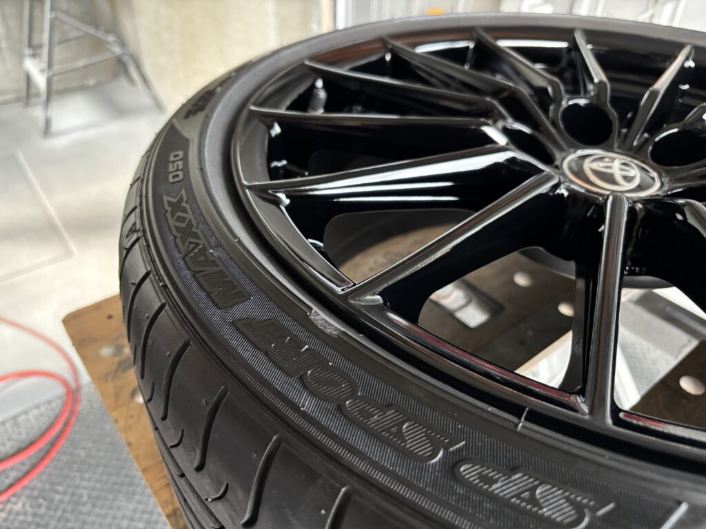 本日はトヨタGRヤリス”RS”の純正ENKEIアルミホイールガリキズ をグロスブラック塗装でリペアさせていただきました。