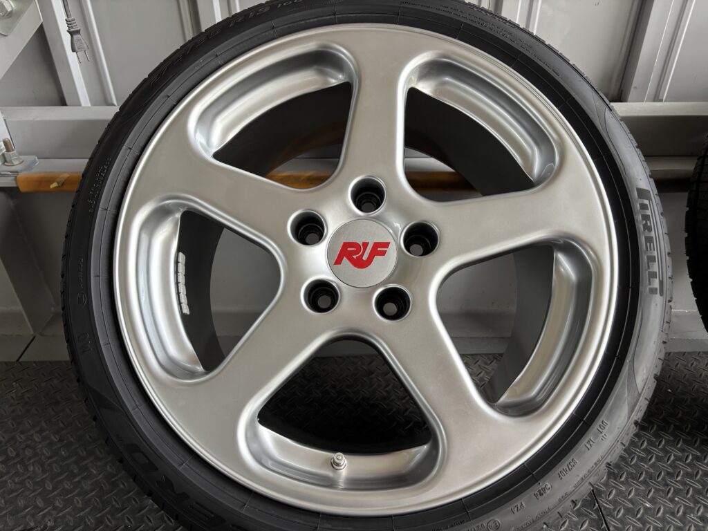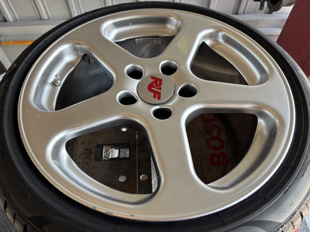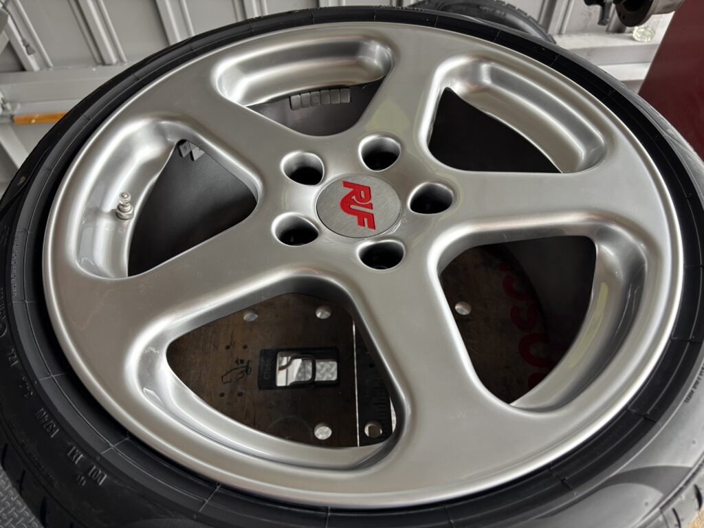 本日はポルシェカスタムパーツのRUFアルミホイールガリキズを下地にブラック塗装を施すハイパーシルバー塗装でリペアさせていただきました。