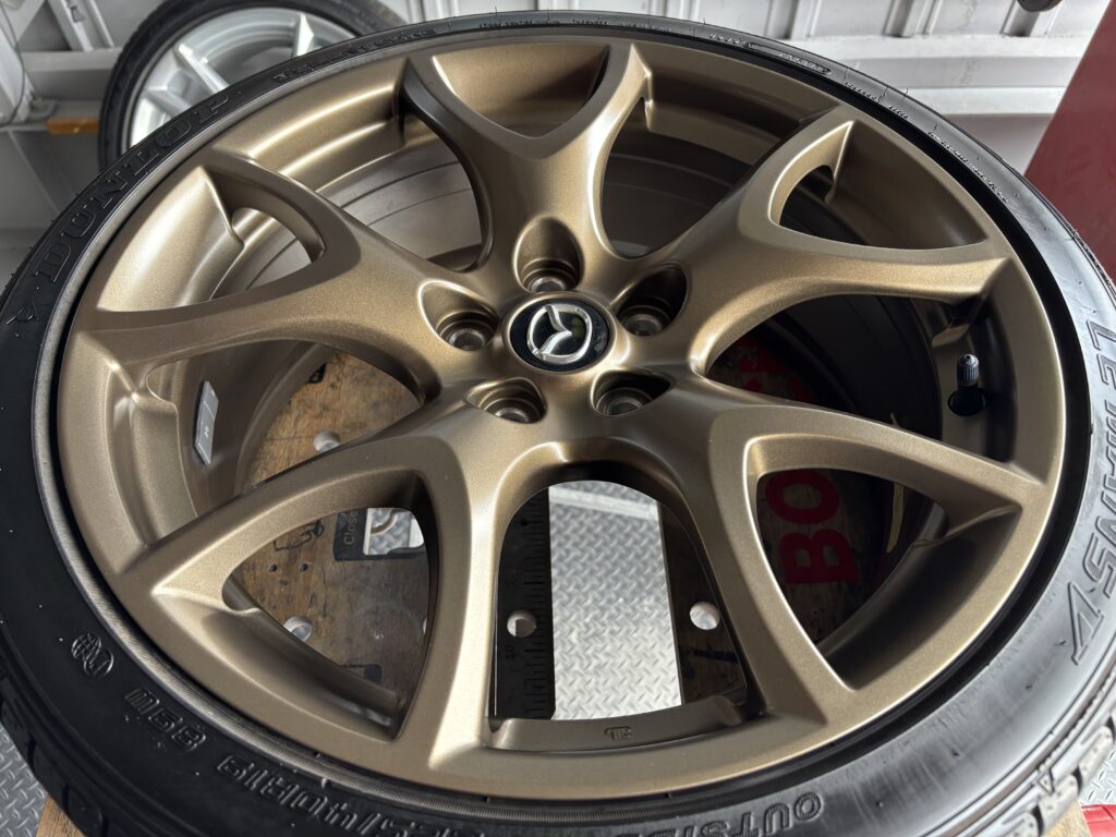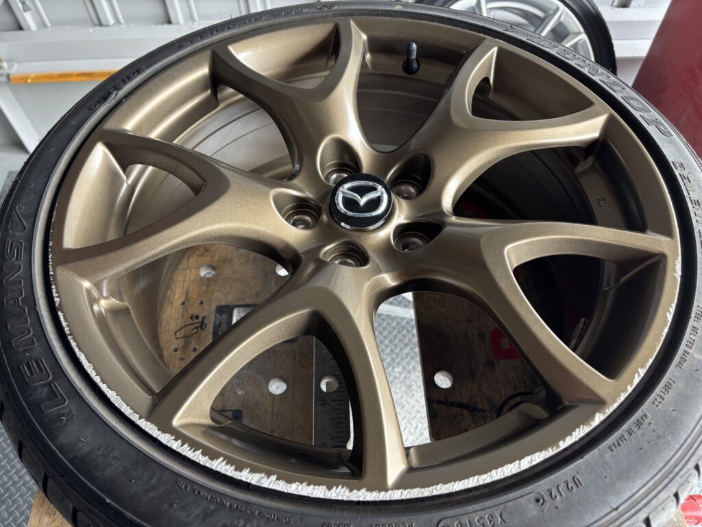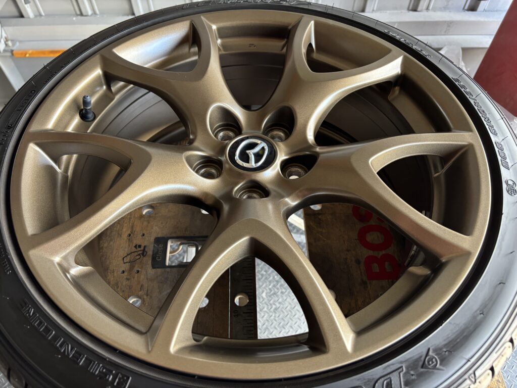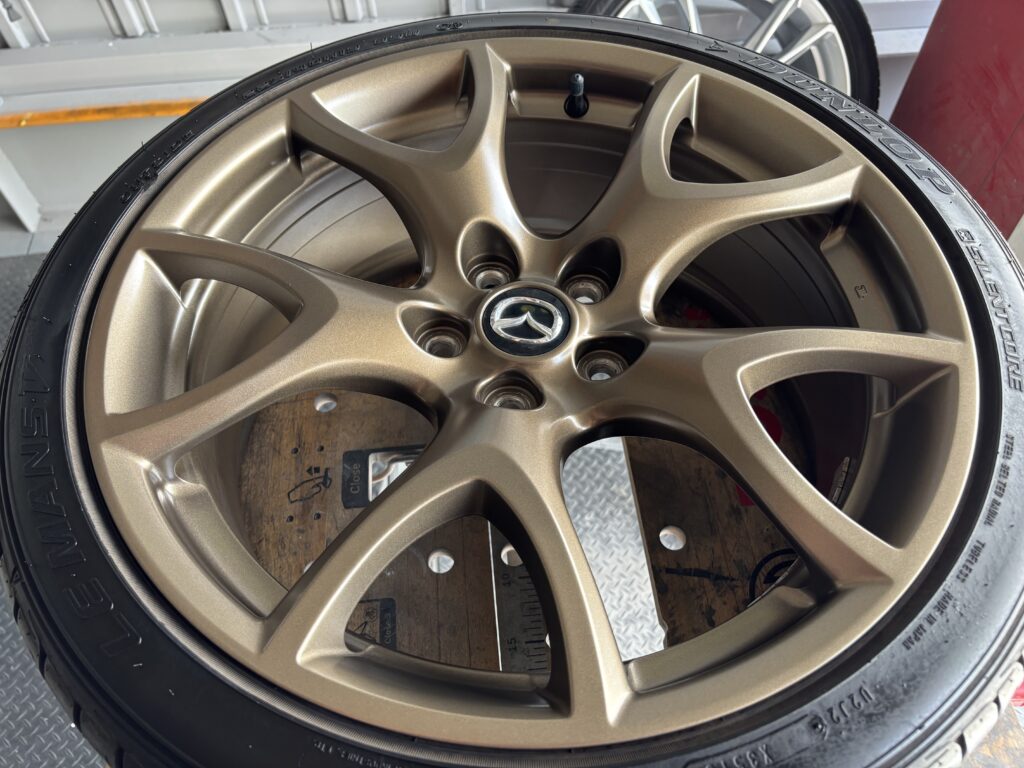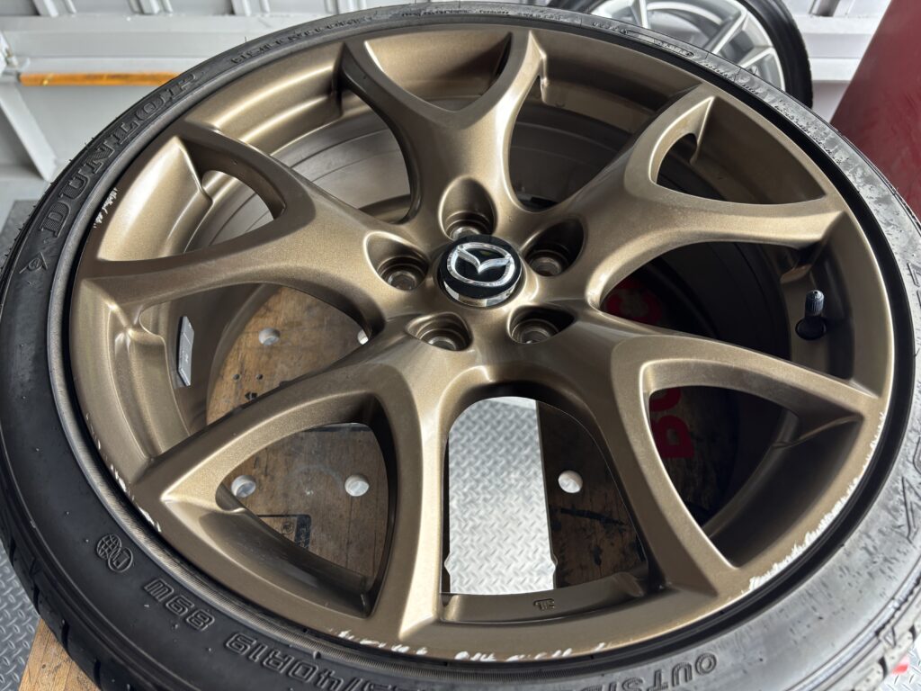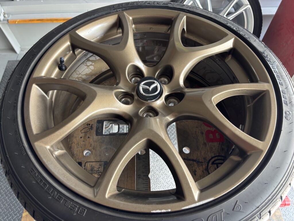 本日はMAZDA RX-8SPIRIT Rの純正アルミホイールガリキズ 3本をブロンズ塗装でリペアさせていただきました。
