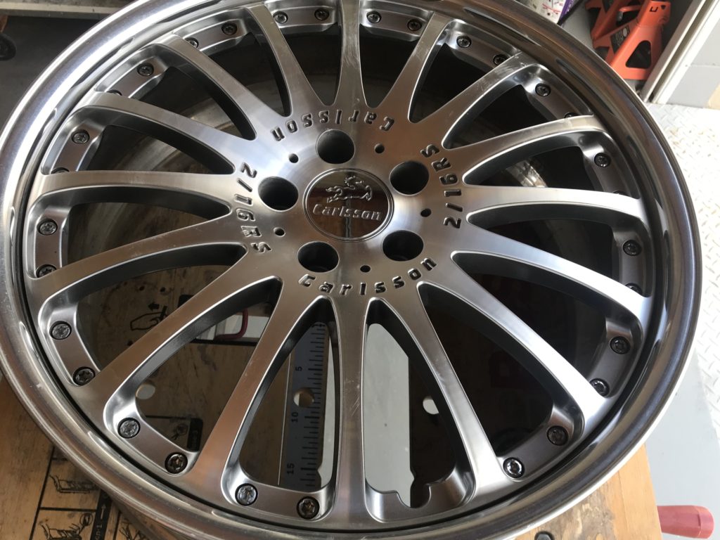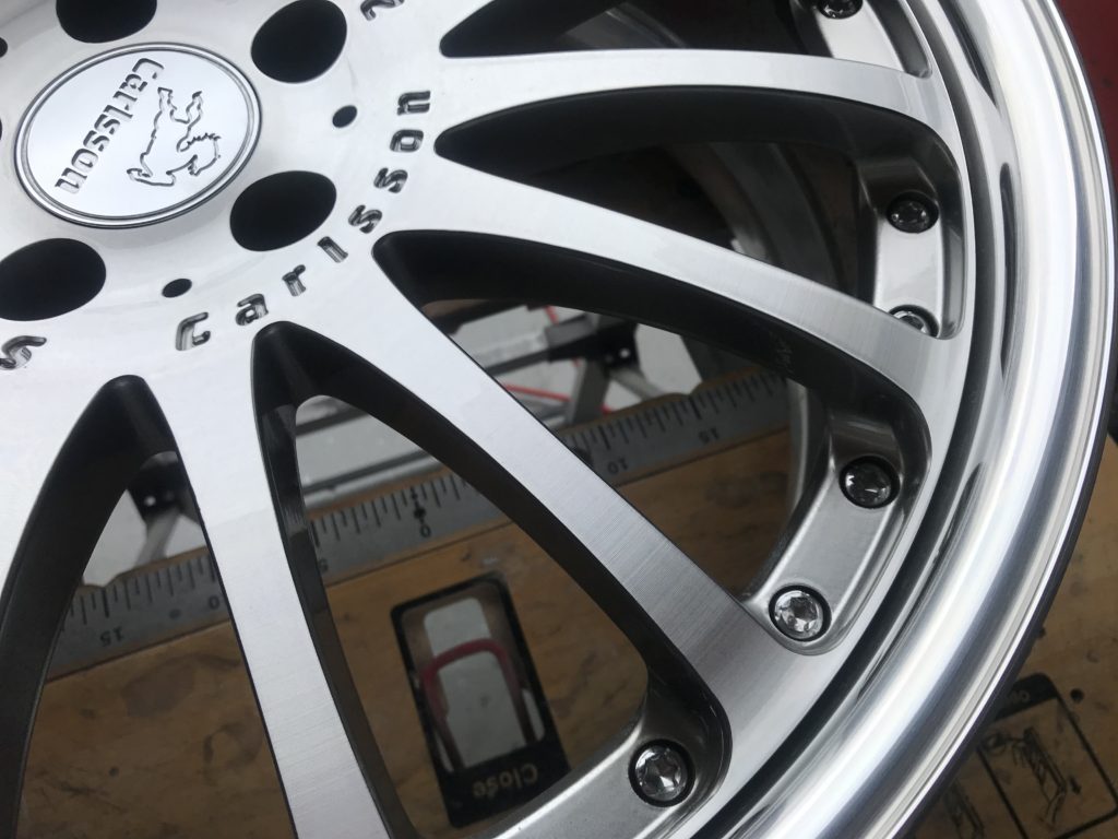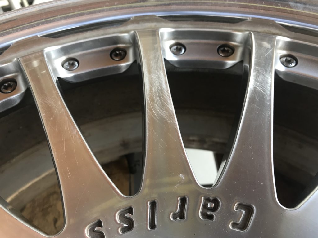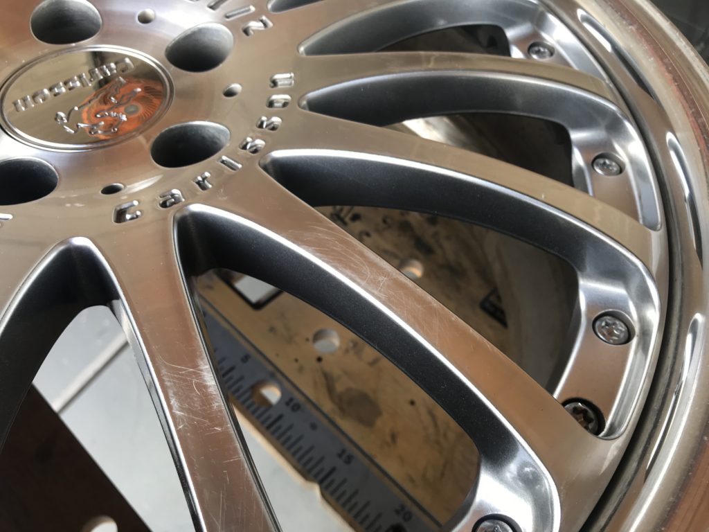 CRAFTS505の施工実績をご覧いただきありがとうございます、本日はカールソン 20inchディスク面の擦りキズやクリア剥がれなど多数の小傷をダイヤモンドカットで切削再生を行い、アルマイト リムのキズを鏡面研磨でリペアさせていただきました。