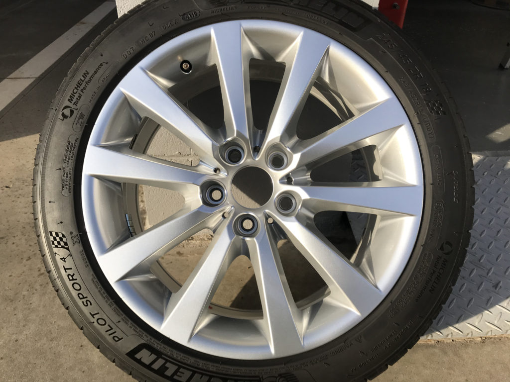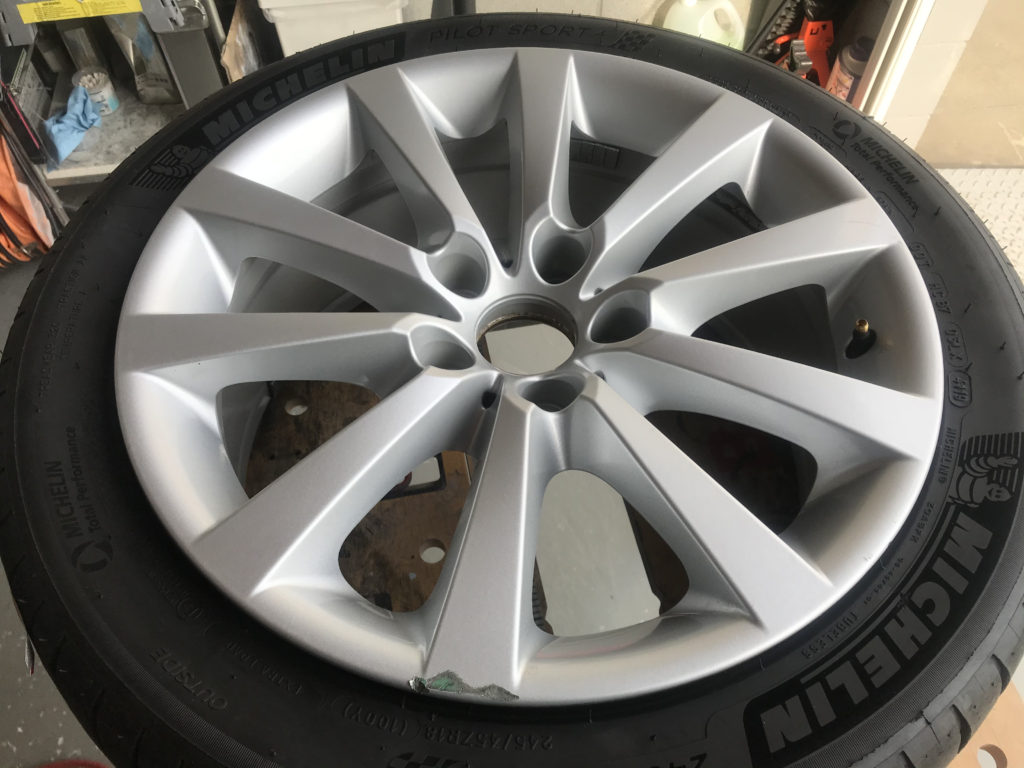 BMW 528i 純正18inchシルバーアルミホイールキズ シルバー塗装リペア専門店 トータルリペア クラフツゴーマルゴにお任せください。神奈川県 横浜市 青葉区 都筑区 鶴見区 神奈川区 西区 中区 南区 保土ケ谷区 磯子区 金沢区 港北区 戸塚区 港南区 旭区 緑区 瀬谷区 栄区 泉区 を中心に近隣の川崎市も対応 アルミホイール修理・キズ・曲がり(歪み)・色変更(カラーチェンジ)とインテリア レザー(革)・合皮・モケット・プラスチックなど車の内装の修理及び修復のプロショップ
