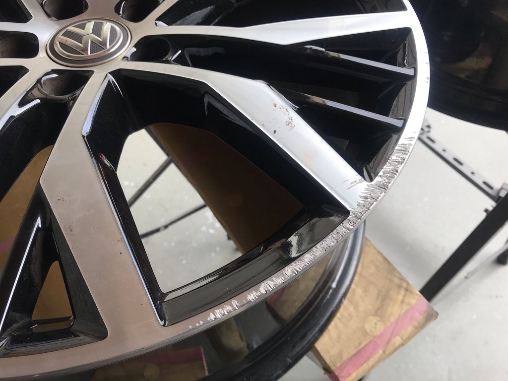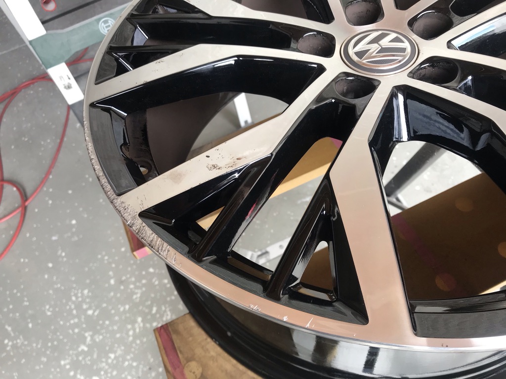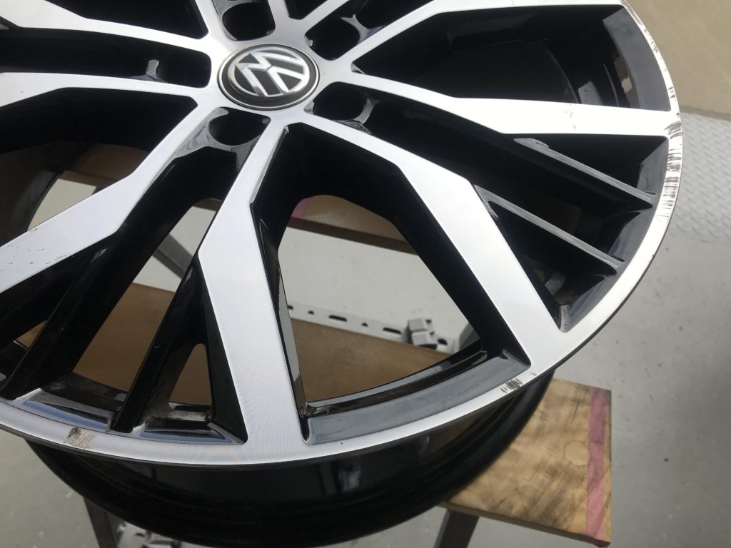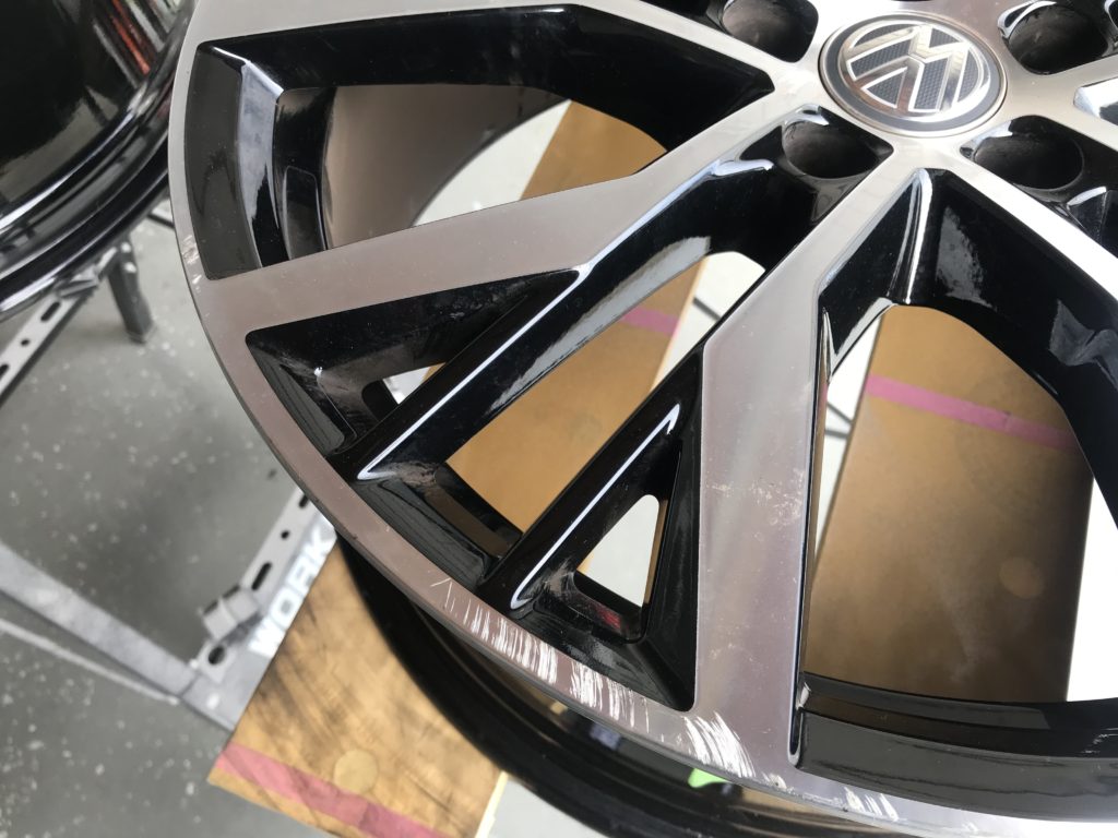 CRAFTS505の施工実績をご覧いただきありがとうございます、本日はフォルクスワーゲン販売店舗様からゴルフGTIのアルミホイールキズ2本を新品同様に仕上げるダイヤモンドカット再生リペアのご依頼をいただきました。